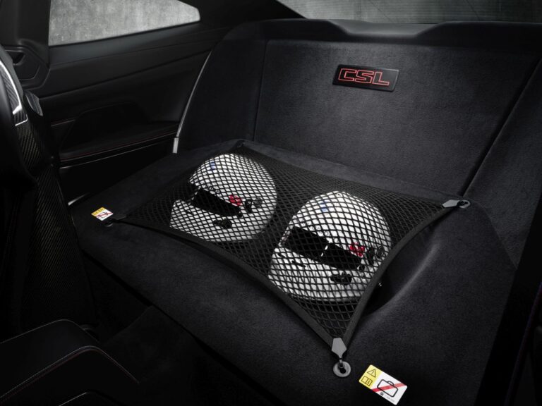 Kierownica M Alcantara, sufit w kolorze antracytowym, paski wykończenia wnętrza z włókna węglowego, oznaczenia „CSL” na fotelach, konsoli centralnej i tylnej paneli, a także wyświetlacze specyficzne dla modelu również przyczyniają się do stworzenia idealnych warunków do skoncentrowanej przyjemności z jazdy. Tapicerka z merino z rozszerzonymi funkcjami oraz pasy bezpieczeństwa M są również standardem. W tylnej części pojazdu znajdują się dwa schowki na kaski.