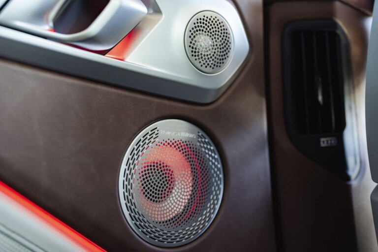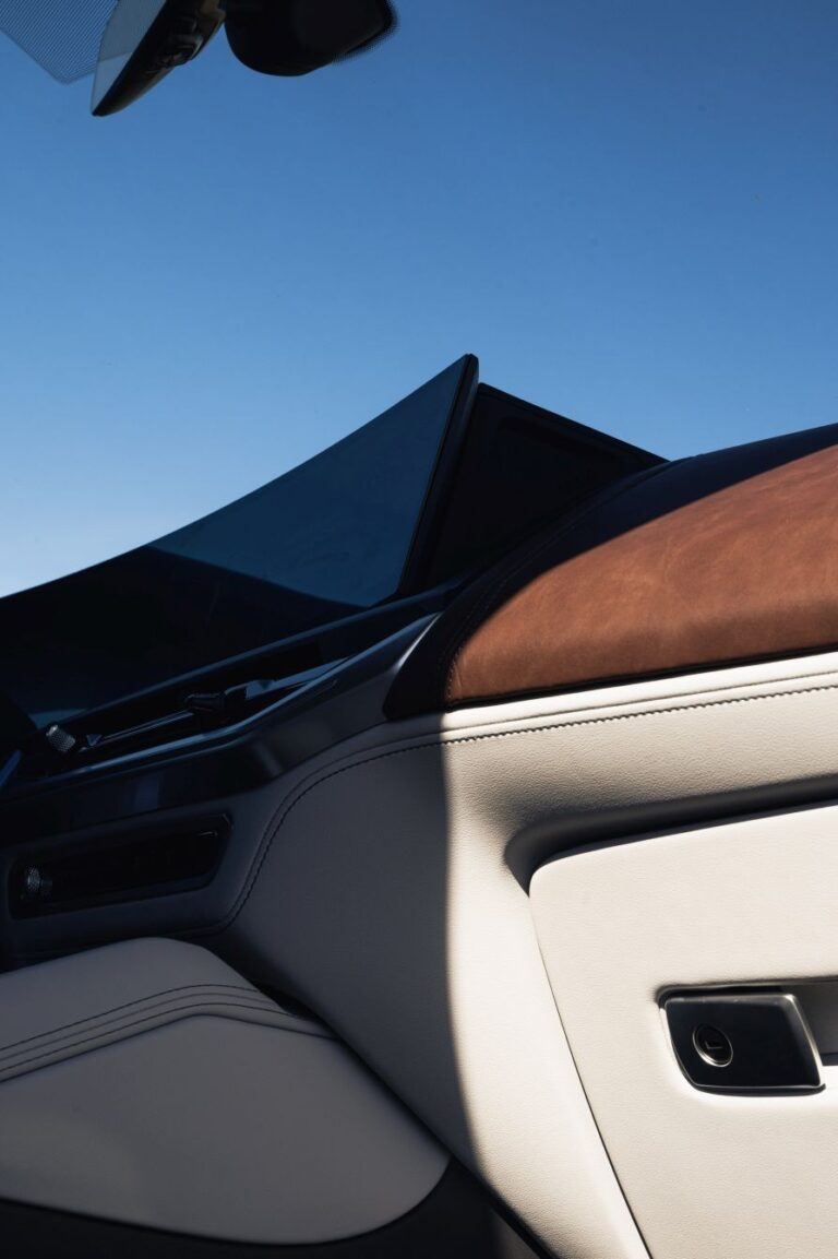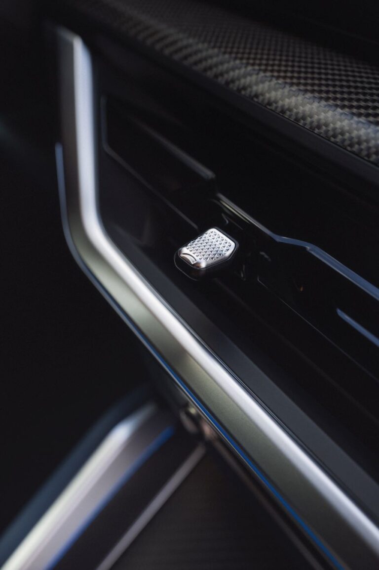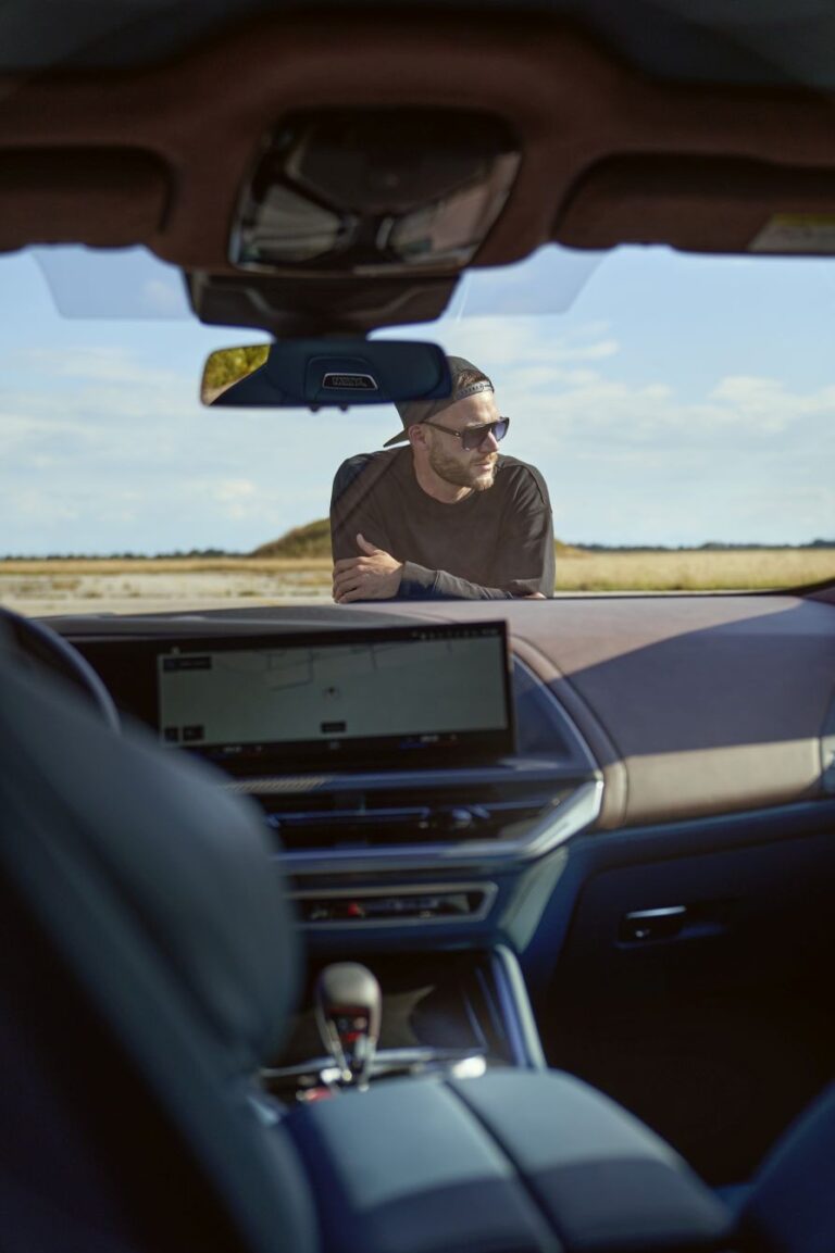 Rzeźbiarski sufit w BMW XM to bardzo specjalny element designu. Trójwymiarowa struktura pryzm z jego powierzchni Alcantary i dyskretne oświetlenie nadają wnętrzu dramatyczny, ale intymny klimat. Włókna optyczne z 100 diodami LED są zintegrowane w „ramie obrazowej” podsufitki, aby wytwarzać stałe lub dynamiczne efekty świetlne wewnątrz, w zależności od sytuacji i wybranego trybu jazdy. Dynamiczne impulsy światła wewnątrz są również używane do sygnalizowania nadchodzącego połączenia telefonicznego lub podkreślenia ryzyka potencjalnej kolizji podczas otwierania drzwi.