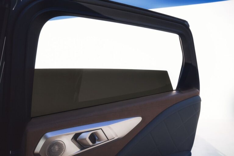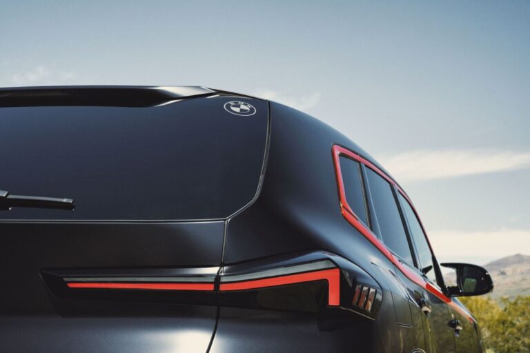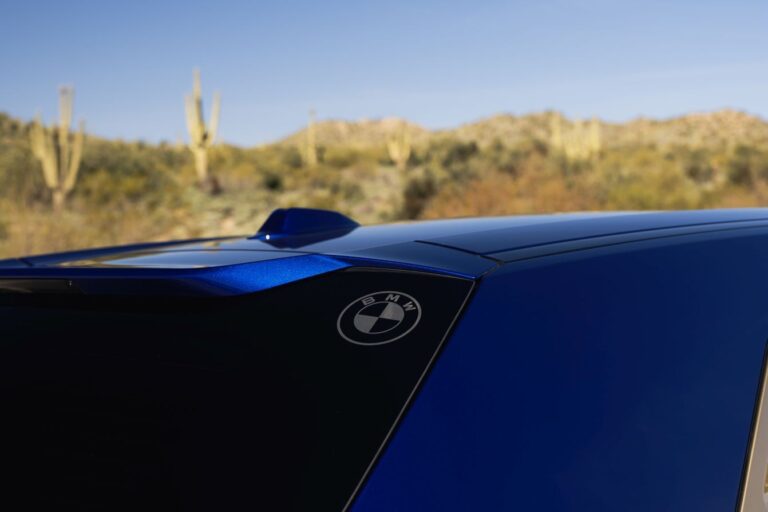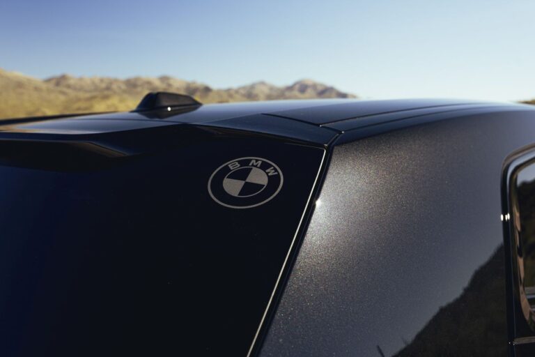 Na tylnej części dachu BMW XM znajduje się wyraźne wklęsłe miejsce, a loga BMW zostały wygrawerowane w tylnej szybie poniżej prawego i lewego słupka. Specjalna technika grawerowania laserowego sprawia, że loga wyróżniają się na tle ciemnej powierzchni szyby.