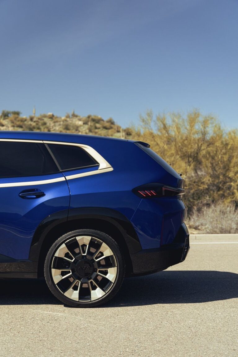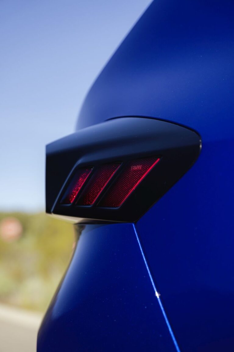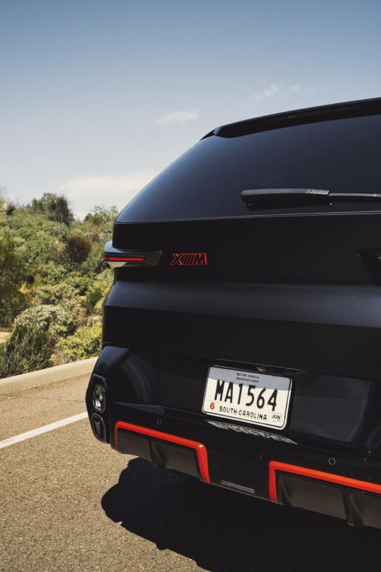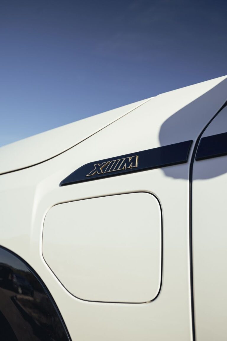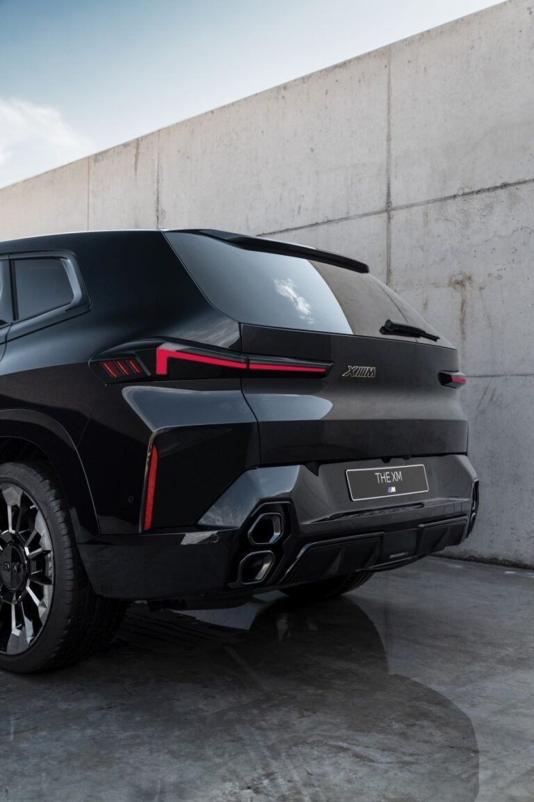 Płaska, niemal bezszwowo dopasowana tylna szyba i wyraźnie rozszerzające się nadkola podkreślają szerokość i potężną posturę BMW XM. Smukłe tylne światła mają rzeźbiarski design i wysunięte są z nadwozia. Tylne światła stają się widoczne tylko przez ciemne osłony soczewek, gdy są aktywowane. Trzy ukośne paski świetlne po bokach nawiązują do stylu trójkolorowego logo BMW M GmbH.