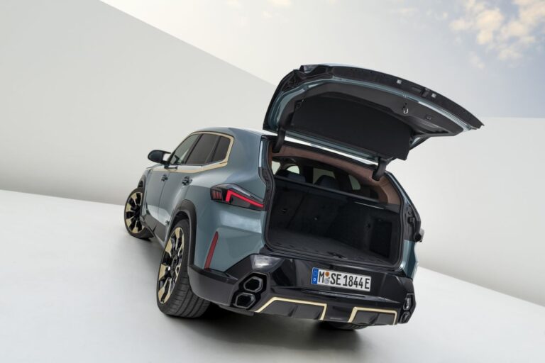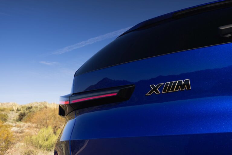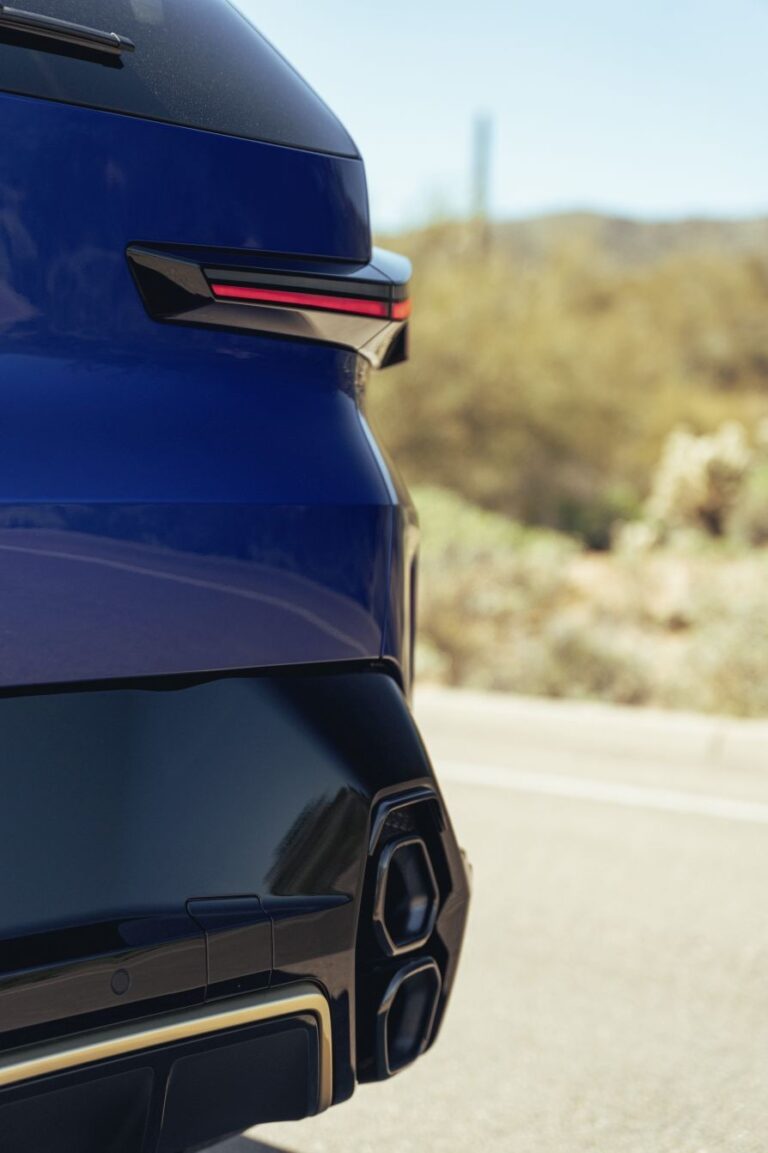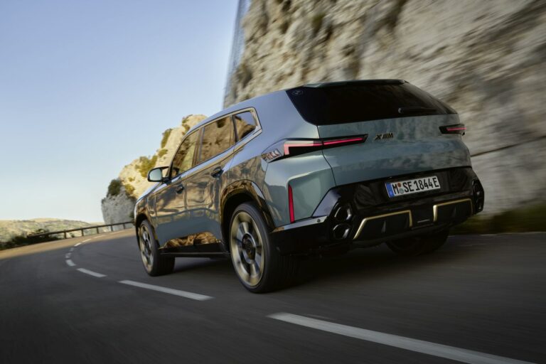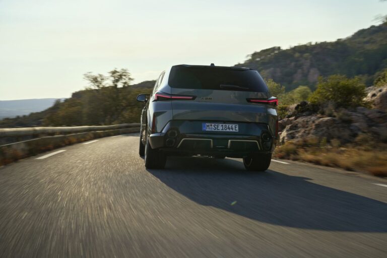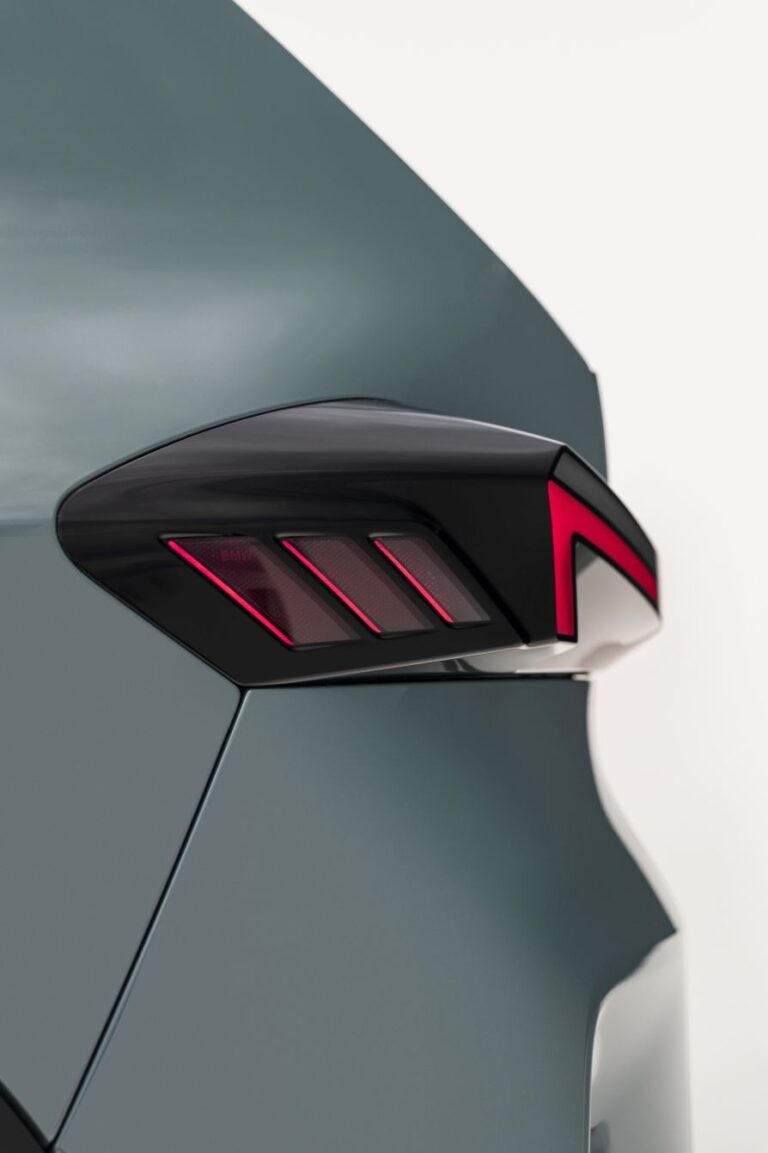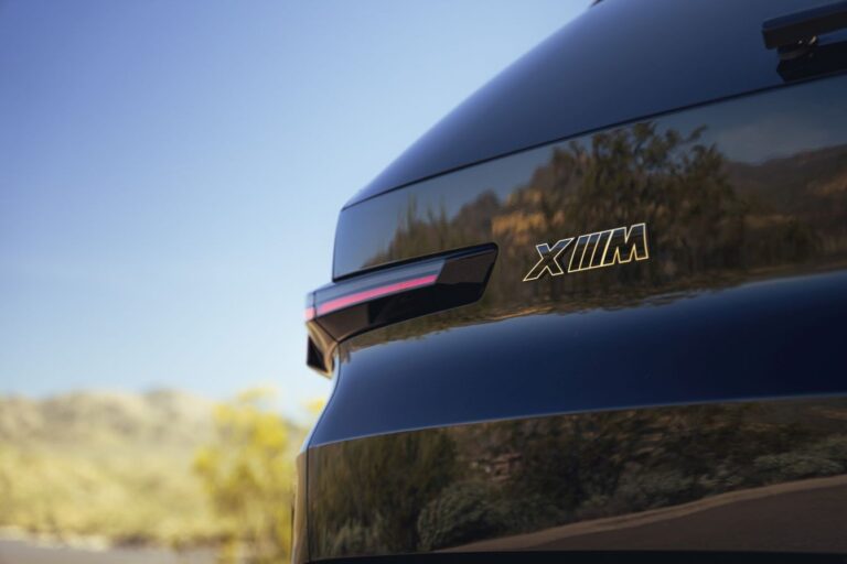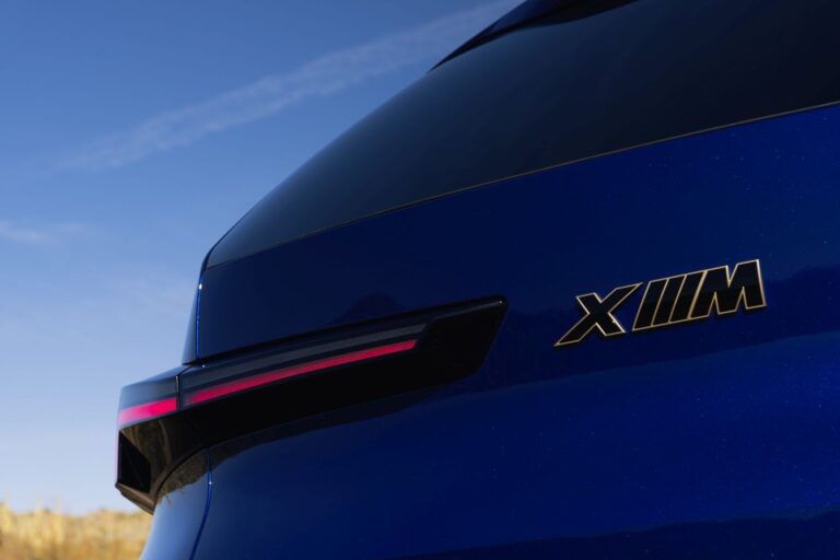 Płaska, niemal bezszwowo dopasowana tylna szyba i wyraźnie rozszerzające się nadkola podkreślają szerokość i potężną posturę BMW XM. Smukłe tylne światła mają rzeźbiarski design i wysunięte są z nadwozia. Tylne światła stają się widoczne tylko przez ciemne osłony soczewek, gdy są aktywowane. Trzy ukośne paski świetlne po bokach nawiązują do stylu trójkolorowego logo BMW M GmbH.