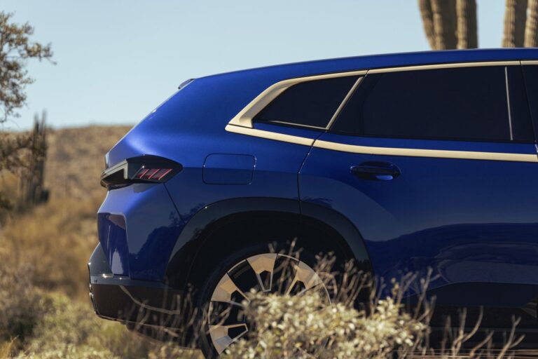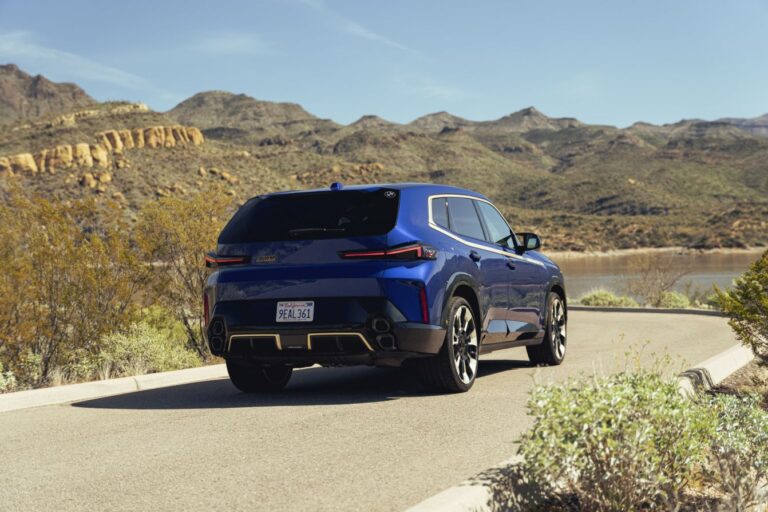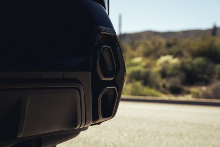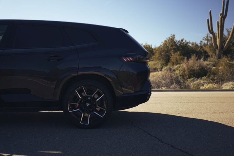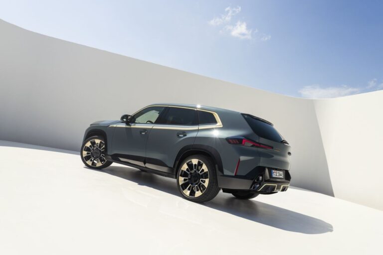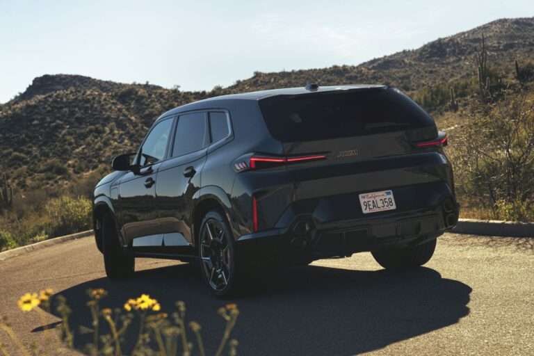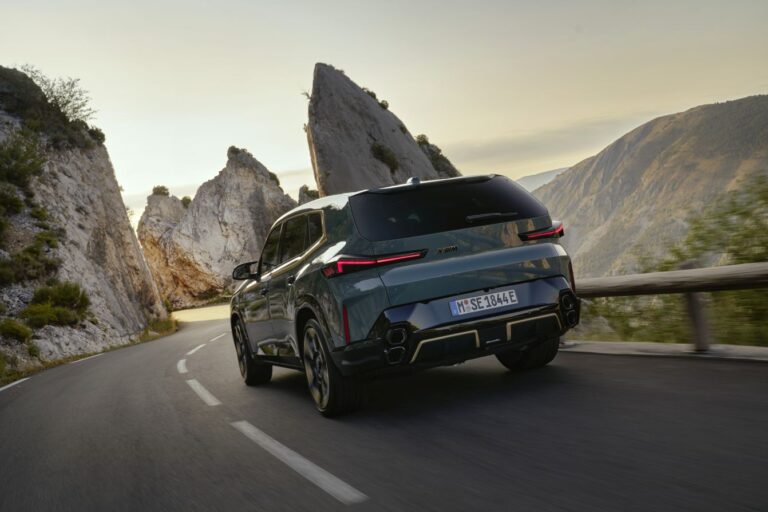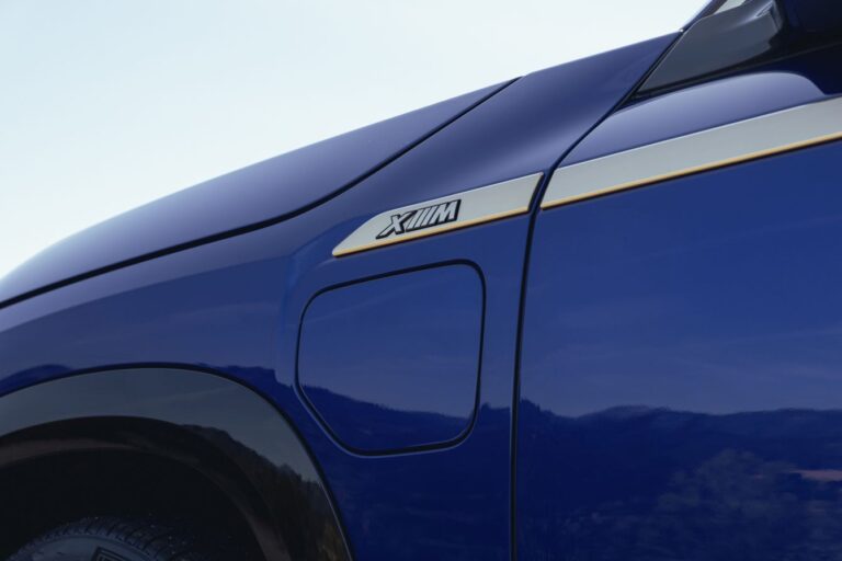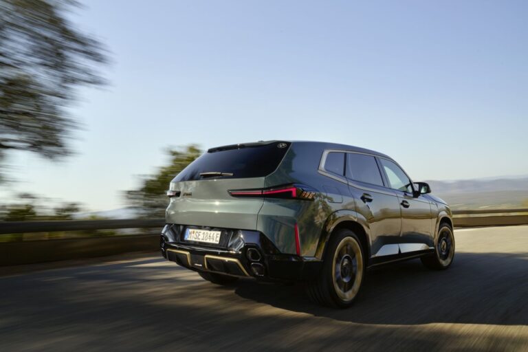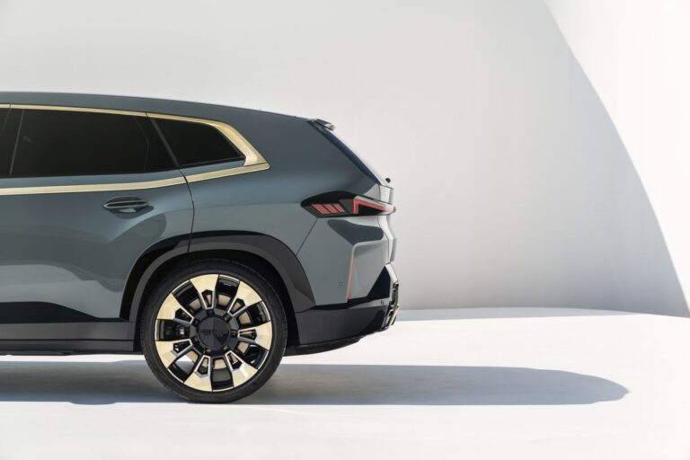 Płaska, niemal bezszwowo dopasowana tylna szyba i wyraźnie rozszerzające się nadkola podkreślają szerokość i potężną posturę BMW XM. Smukłe tylne światła mają rzeźbiarski design i wysunięte są z nadwozia. Tylne światła stają się widoczne tylko przez ciemne osłony soczewek, gdy są aktywowane. Trzy ukośne paski świetlne po bokach nawiązują do stylu trójkolorowego logo BMW M GmbH.