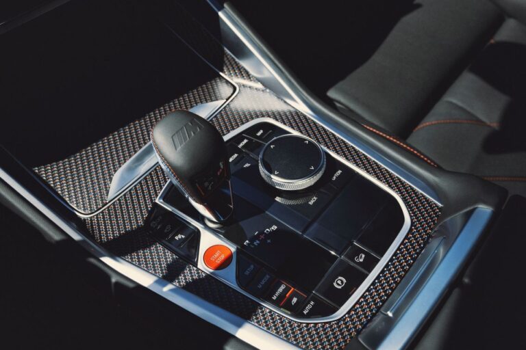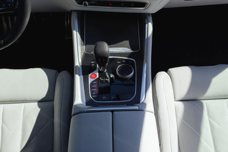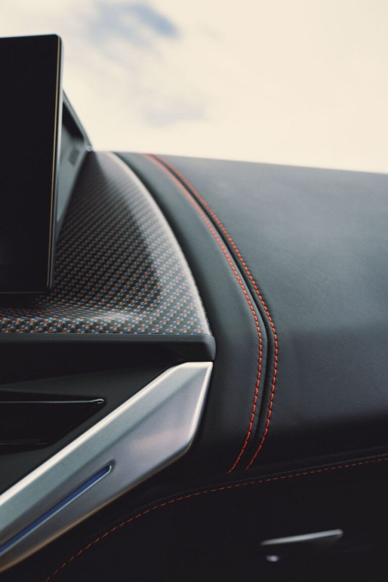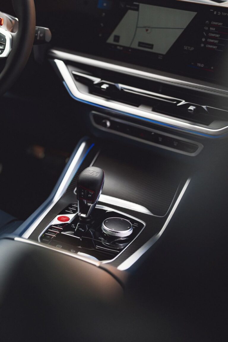 Wyświetlacz BMW Curved jest umieszczony na przestronnym, matowym carbonowym dekorze. M-typowe elementy z włókna węglowego w desce rozdzielczej łączą się z szerokimi obramowaniami wlotów powietrza w chromie perłowym. Powierzchnia centralnej konsoli także wykonana jest z matowego włókna węglowego.