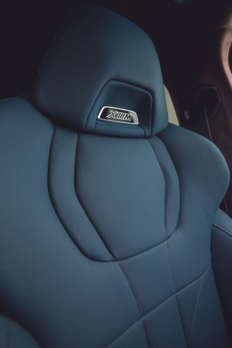 Cztery warianty wyposażenia pozwalają klientom na wybór własnych materiałów powierzchniowych i schematów kolorystycznych dla wnętrza BMW XM. Standardowe wyposażenie składa się z tapicerki skórzanej BMW Individual Merino z powierzchniami wnętrza i siedzeń w kolorze czarnym oraz kontrastowym przeszyciem w czarnym szarym, podczas gdy górna część deski rozdzielczej i ramiona drzwi pokryte są miękką skórą Nappa czarną. Podobnie jak podsufitka, słupki A, B i C również pokryte są Alcantarą. Tapicerka skórzana BMW Individual Merino jest również dostępna jako opcja z powierzchniami w kolorze Sakhir Orange dla siedzeń, centralnej konsoli i dolnej części deski rozdzielczej oraz czarną skórą Nappa na desce rozdzielczej i górnych częściach wykończenia drzwi.