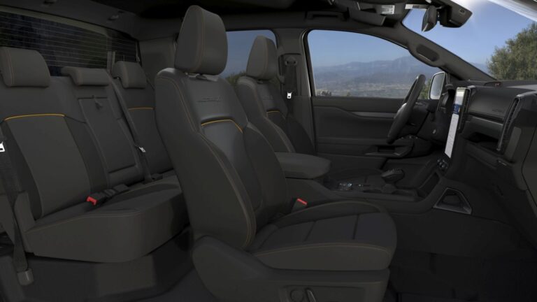 Wewnątrz pasażerowie korzystają z unikalnych foteli wykończonych mikrofibrą Miko z ekskluzywnym haftem Wildtrak X, wspieranym miękkim materiałem Terra z kontrastowymi pomarańczowymi szwami na górnym panelu deski rozdzielczej, wykończeniach drzwi i konsoli środkowej. Wbudowana łączność jako standard do FordPass 6 i usług Ford Pro, takich jak FORDLiive, poprawia komfort posiadania.
