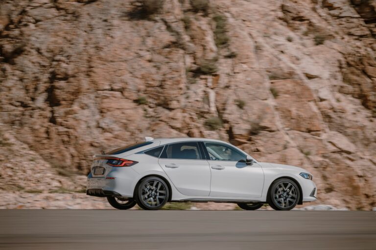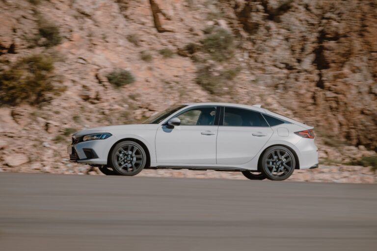W profilu Honda Civic e:HEV prezentuje nowoczesną, uporządkowaną estetykę, z detalami takimi jak płaskie klamki z czytnikami dotykowymi, eliminujące potrzebę przycisku blokady. Dodatkowo, lusterka boczne są teraz przymocowane bezpośrednio do przednich drzwi poniżej linii okien, zamiast do przedniej krawędzi okien przednich drzwi, co pomaga zredukować zbędne martwe punkty.