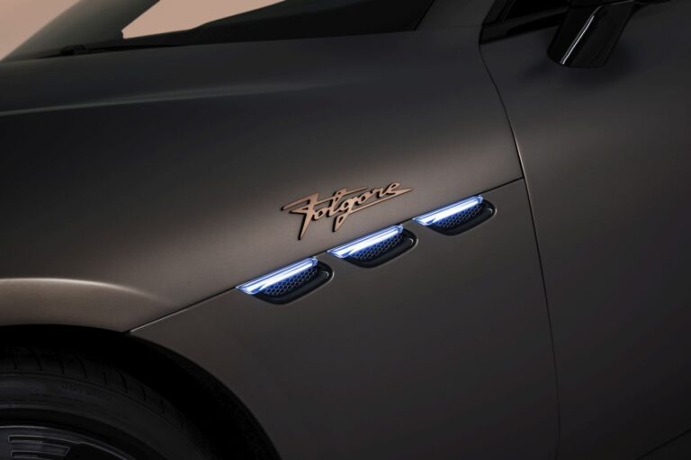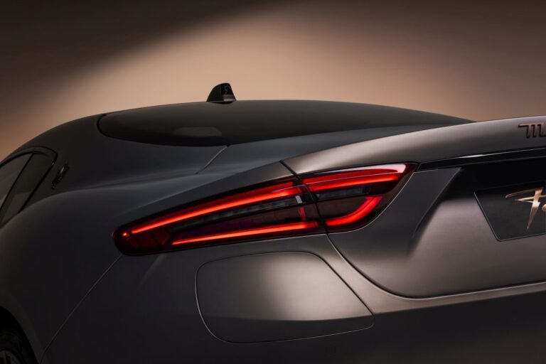 Zachowano klasyczne proporcje samochodów marki, z długą maską i centralną karoserią przecinaną przez cztery błotniki. Z kolei linia dachu opada dynamicznie, podkreślając krzywiznę słupka, na którym znajduje się ikoniczne logo Tridente.