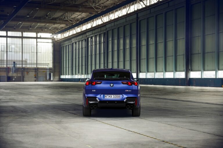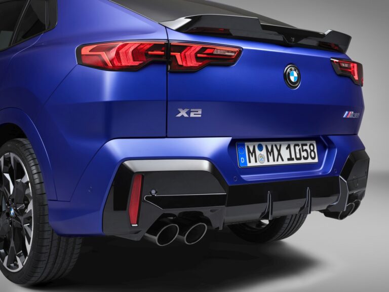 Pod mocno pochyloną tylną szybą, odważny spojler w stylu Gurneya generuje dodatkowy docisk nad tylną osią. Wklęsła powierzchnia poniżej tylnego spojlera tworzy efekt trójwymiarowy i dodaje dodatkowej napiętości. Tylny zderzak specyficzny dla nowego BMW X2 składa się z czarnej powierzchni, która otacza uchwyt na tablicę rejestracyjną i rozciąga się do krawędzi nadwozia, oraz sekcji pomalowanej w kolorze nadwozia poniżej. Wstawki stylizowane jako wloty powietrza oraz pionowe reflektory dodatkowo wzbogacają sportowy charakter. Łączniki układu wydechowego na wszystkich wariantach z silnikiem spalinowym – z wyjątkiem nowego BMW X2 M35i xDrive – są zintegrowane w tylnej części zderzaka, ukryte przed wzrokiem.