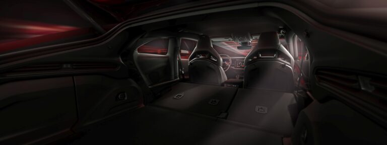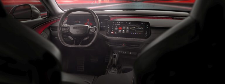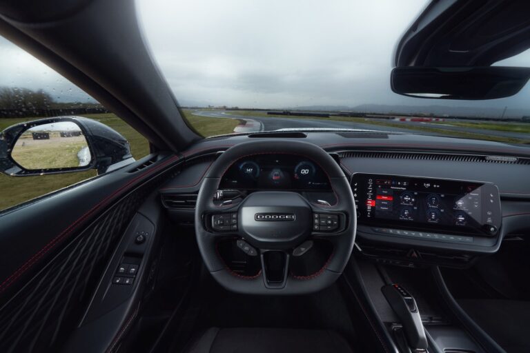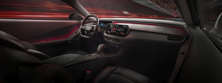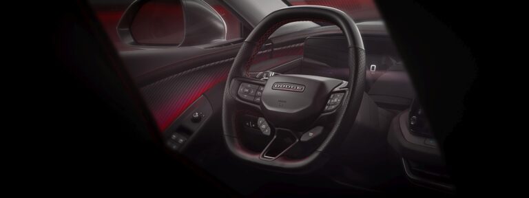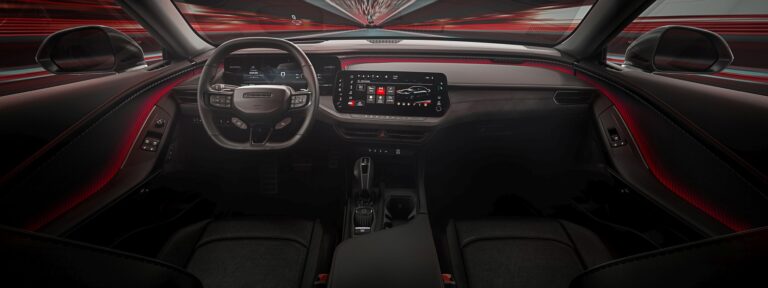 Dynamiczna, warstwowa deska rozdzielcza i temat konsoli mieszczą samodzielne, szerokie ekrany 10.25-calowe lub opcjonalne 16-calowe, z 12.3-calowym wyświetlaczem centralnym umieszczonym w kątowej centralnej kolumnie, co zapewnia unikalne, rzeźbione wnętrze z nowoczesnym technicznym odczuciem. Linie i tekstury przypominają ikoniczną deskę rozdzielczą Dodge’a Chargera z 1968 roku, przeskalowaną w objętościach, które wydają się lżejsze i wspierają ideologię nowoczesnego pojazdu sportowego, którego tylko Dodge mógłby stworzyć.