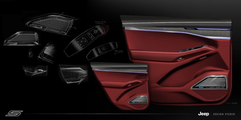 Przednia kabina Jeep Wagoneer S zdobiona jest wieloma nowymi detalami, w tym nowym czarnym aluminium ceramicznym z hapticzną aplikacją, które pojawia się na wielu punktach dotykowych pojazdu. Szczególnie na centralnym panelu sterowania kierowcy, ekskluzywny dotykowy wzór nawigacyjny jest chłodny w dotyku i ma porcelanowy charakter. Drzwi są wykończone dekoracyjnymi akcentami, w tym rzeźbionymi metalowymi detalami, które pasują do deski rozdzielczej.