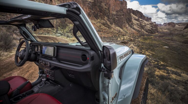 Nowy, 12,3-calowy ekran dotykowy – najnowocześniejszy i największy wyświetlacz kiedykolwiek oferowany w Wranglerze – umieszcza system piątej generacji Uconnect 5, który zdobył nagrody, i znajduje się w wyraźnym miejscu na górze centralnego panelu, tuż nad nowym wąskim prostokątnym wentylatorem powietrza. Zewnętrzne wentylatory powietrza zachowują swój charakterystyczny okrągły kształt.