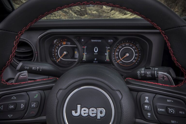 W środku w porównaniu do swojego poprzednika zastosowano ogromne ulepszenia. Na górnej części konsoli centralnej producent zamontował 12-calowy ekran dotykowy dla systemu infotainment Uconnect 5. Ale Jeep również skoncentrował się na komforcie klientów i dodał fotele z elektrycznym sterowaniem. W ramach nowej linii Rubicon zyskał również adaptacyjny tempomat, poduszki powietrzne boczne oraz monitor martwego pola. Ta wersja miała też czerwone haftowane litery Rubicon 392 na oparciach przednich foteli.