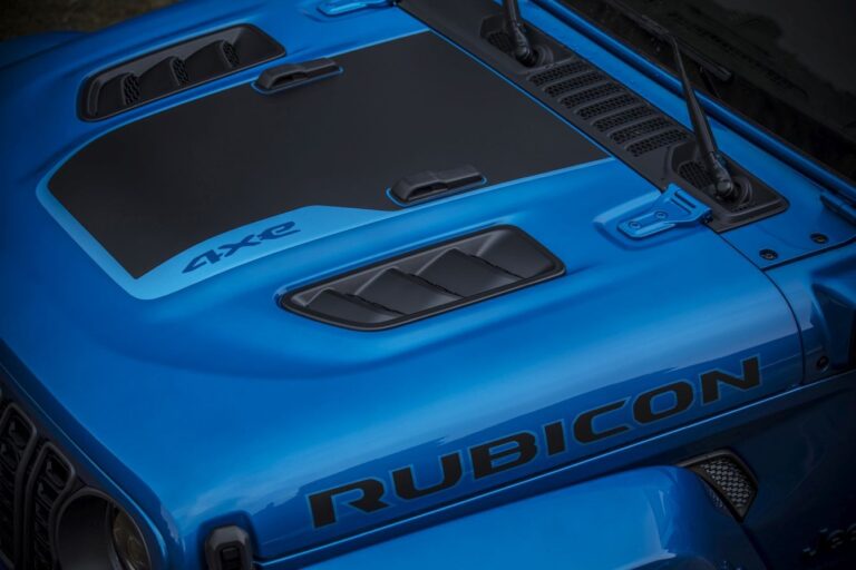 Rubicon 4xe, z charakterystycznym mniejszym przodem, podobnie jak jego „rodzeństwo”, ma niebieskie haki holownicze, które są typowe dla wersji hybrydowej. W odróżnieniu od standardowego 4xe, ten twardy pojazd terenowy wyposażono w nowy przedni zderzak zaprojektowany do zamontowania wciągarki Warn o udźwigu 8000 funtów. Dodatkowo, standardowo zamontowano opony BFGoodrich All-Terrain o rozmiarze 33 cali. Podobnie jak reszta gamy Wranglerów z hybrydowym napędem, ta wersja została także wyposażona w system V2L, który pozwalał użytkownikom na dostarczanie prądu do przyczepy kempingowej lub innych urządzeń.