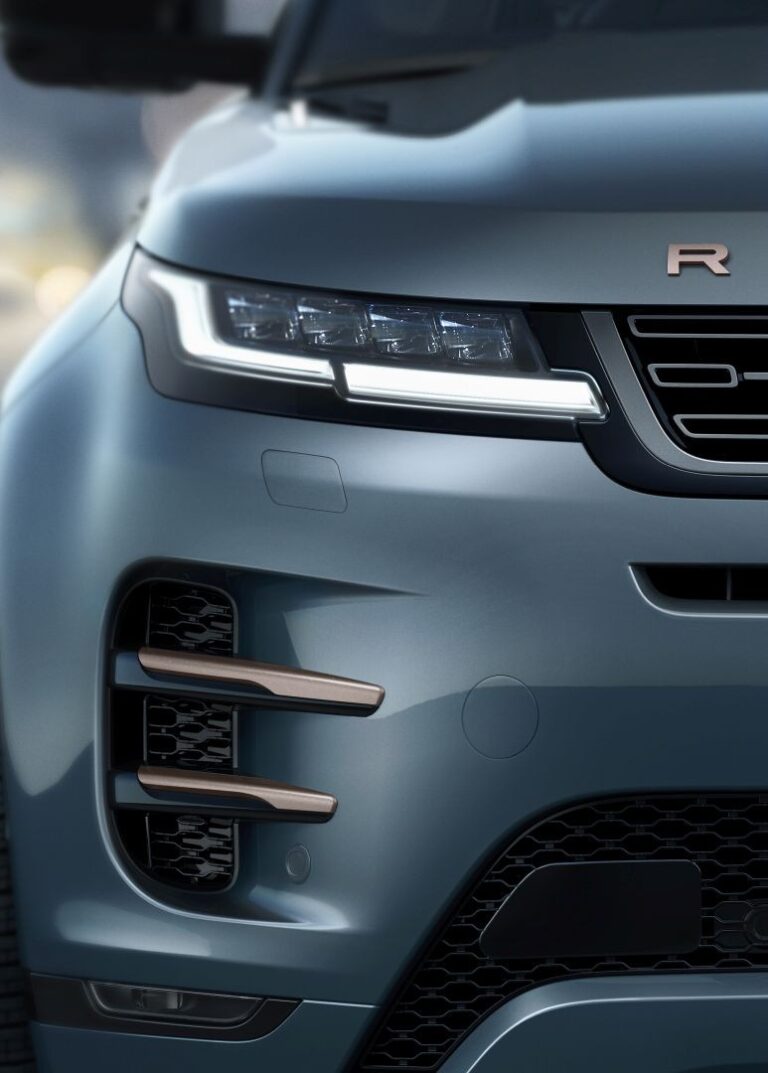 Minimalistyczny wygląd zewnętrzny Evoque został ulepszony dzięki nowemu grillowi i ultracienkim reflektorom Pixel LED z charakterystycznym światłem dziennym, które nadają mu techniczny, klejnotowy wygląd. Nowe akcenty zewnętrzne i kolory doskonale współgrają z charakterystycznym unoszącym się dachem, nieprzerwaną linią boczną i chowanymi klamkami, które definiują design Range Rovera.
