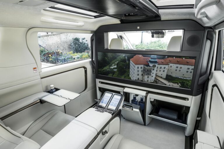 Przegroda oddziela przednie i tylne siedzenia. Górna część zawiera składane szklane okno z funkcją przyciemniania, oferując dwa poziomy prywatności bez poświęcania uczucia przestronności. Poniżej znajduje się duży 48-calowy wyświetlacz, który można wykorzystać do różnych celów, w tym do spotkań online i rozrywki. Lodówka i schowki znajdują się pod wyświetlaczem.