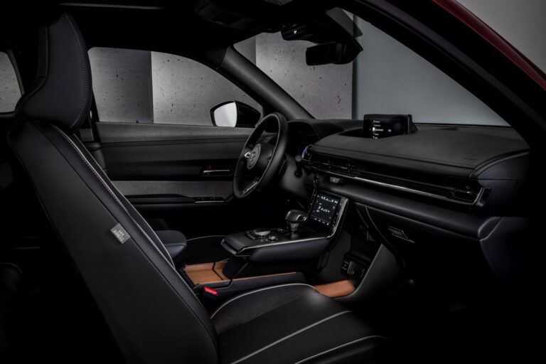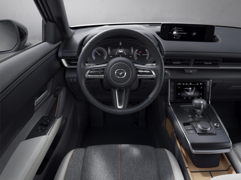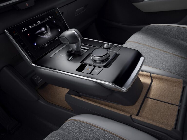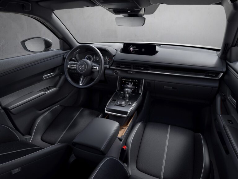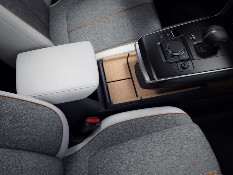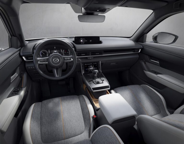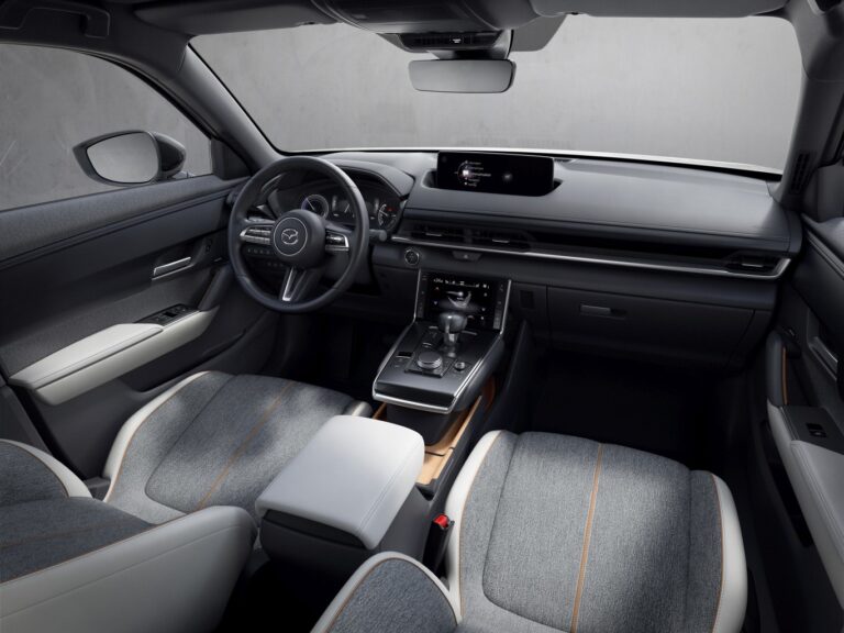 Wewnątrz powita nas kabina w większości wykonana z materiałów włóknistych. Na przykład tapicerka drzwi pokryta jest włóknami z recyklingowanych butelek plastikowych, podczas gdy części wykończenia środkowej konsoli mają fakturę nazwaną Heritage Cork, materiał pozyskiwany z kory drzew bez ich wycinania. Po raz pierwszy w produkcyjnym modelu Mazdy zainstalowano 7-calowy panel dotykowy do sterowania ogrzewaniem, co zapewnia lepszą kontrolę.