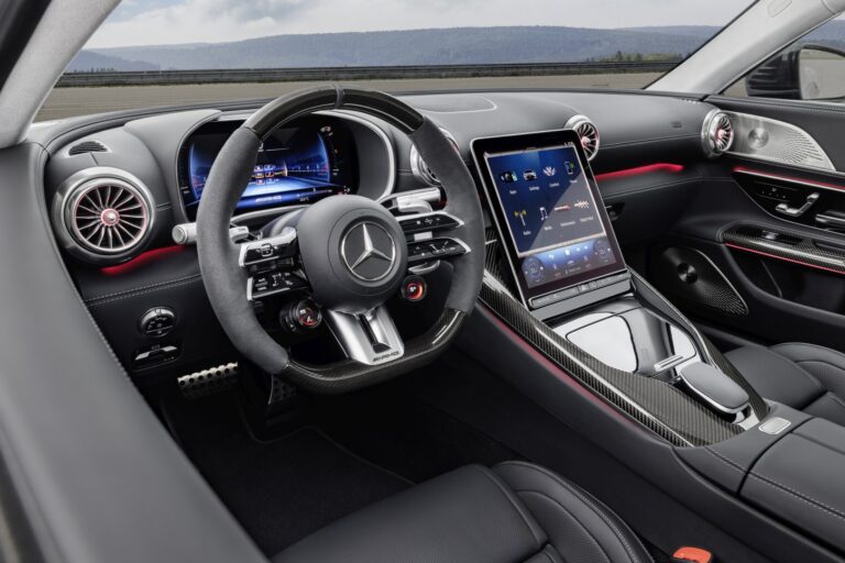 Konsola środkowa przechodzi w dolną część deski rozdzielczej. Funkcjonalnym i optycznym centrum jest 11,9-calowy multimedialny ekran dotykowy. Format portretowy oferuje wyraźne korzyści, szczególnie w nawigacji, a także większą ergonomiczną swobodę. Olśniewające widoki na ekranach LCD ułatwiają sterowanie funkcjami pojazdu i komfortu. Wyświetlacz kierowcy i centralny są ze sobą harmonijnie skoordynowane. Wygląd zestawu wskaźników można personalizować z wybieranymi indywidualnie głównymi widokami. System infotainment MBUX (Mercedes-Benz User Experience) jest intuicyjny w obsłudze i zdolny do nauki. Oferuje rozbudowaną zawartość specyficzną dla AMG w pięciu stylach wyświetlania. Ekskluzywne pozycje menu, takie jak „AMG Performance” czy „AMG TRACK PACE”, podkreślają sportowy charakter.