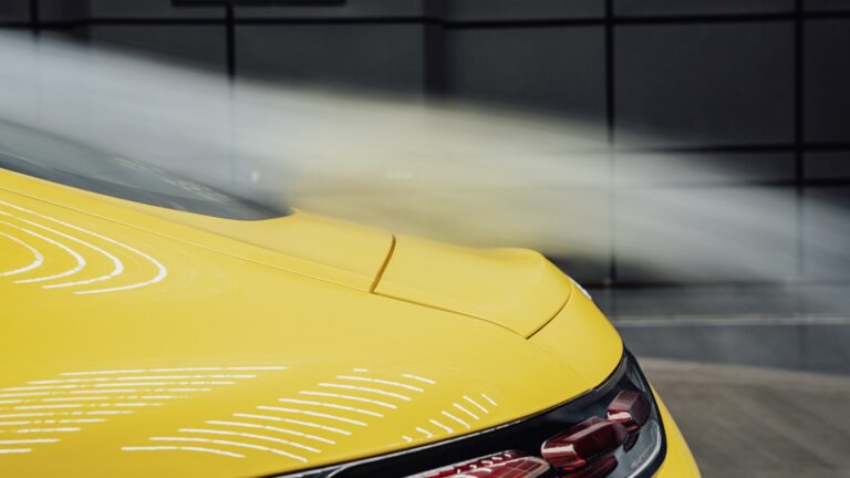 Kompaktowa zielona strefa z sylwetką fastback i dużą klapą bagażnika pozwala na zaprojektowanie niskiej i zaokrąglonej tylnej części z aktywnym, wysuwanym spojlerem. Precyzyjny detal wykończenia błotników tworzy wyraźny kontrast do czystych i pełnych powierzchni. Wyraźnie podkreślony obszar ramienia nadaje pojazdowi idealną równowagę elegancji i sportowości. Płaskie, poziomo połączone LED-owe światła tylne z wyraźną i precyzyjną grafiką są precyzyjnie osadzone w tylnej części nadwozia. Ciemne LED-owe światła tylne tworzą doskonałą symbiozę z przednimi reflektorami dzięki trójwymiarowemu „znakowi świetlnemu”. Oprócz funkcji sygnalizacji świetlnej, oferują również animację „Coming Home/Leaving Home” jako standard. Ekspresyjny dyfuzor tylny z formalnie zintegrowanymi potrójnymi końcówkami wydechu dopełnia dynamiczny design z tyłu.