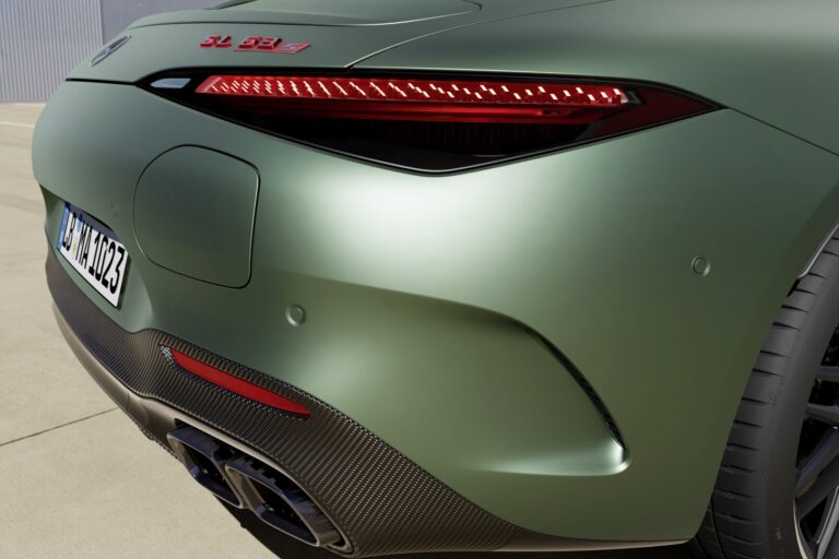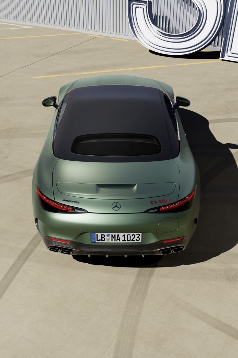 Wyłącznym znakiem rozpoznawczym nowego modelu topowego w serii SL jest tylna część nadwozia. Nowością jest zintegrowana klapka do ładowania plug-in oraz modelowa nazwa wyróżniona na czerwono. Na zewnątrz znajdują się również rowkowane trapezoidalne końcówki rur wydechowych. Emblemat „E PERFORMANCE” na błotniku wskazuje na ekskluzywny napęd. Standardowo hybryda wyposażona jest w 20-calowe wieloramienne felgi AMG z lekkiego stopu. Są one zoptymalizowane aerodynamicznie, pomalowane na matową czerń z wysokim połyskiem. Wymiary na przedniej osi to 265/40 R 20 na 9,5 J x 20, a na tylnej osi 295/35 R 20 na 11 J x 20.