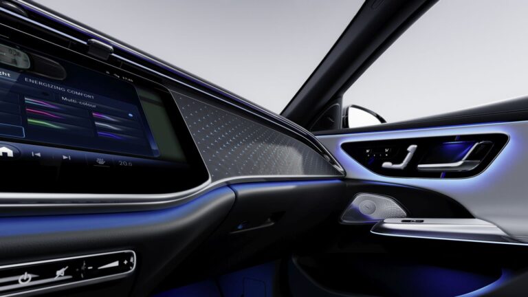 Dzięki nowemu Active Ambient Lighting z Wizualizacją Dźwięku, pasażerowie w nowej Klasie E mogą doświadczać muzyki trzema zmysłami: utwory muzyczne i dźwięki z filmów lub aplikacji mogą być słyszane (z technologią Dolby Atmos®, jeśli zajdzie taka potrzeba), odczuwane (dzięki transduktorom rezonansowym w opcjonalnym systemie dźwiękowym Burmester® 4D) i teraz także „widoczne”. Wizualizacja odbywa się na pasku świetlnym Active Ambient Lighting (opcjonalne). Po raz pierwszy dotyczy to całej Klasie E. Na przykład szybkie sekwencje uderzeń mogą powodować szybkie zmiany światła, podczas gdy płynne rytmy mogą tworzyć łagodnie łączące się nastroje oświetleniowe.