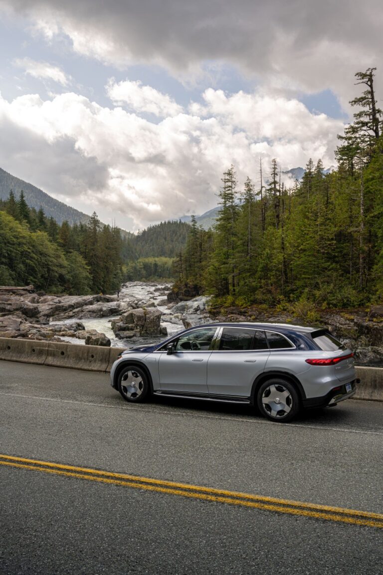 Z boku wyróżniają się charakterystyczne cechy, takie jak śmiałe chromowane obramowania na bocznych oknach oraz chromowane wykończenie słupka B. Ten element dekoracyjny jest integralną częścią logo Mercedes-Maybach i podkreśla długość tylnej części siedzeń. Emblemat Maybacha na słupku D podkreśla wysoką jakość. Napisy EQS są subtelnie wkomponowane w trójkąt przedniej szyby. Wyraziste nadkola z osłonami w wysoki połysku podkreślają siłę SUV-a i emocjonalną obecność. Odpowiednio, Mercedes-Maybach EQS SUV jeździ na ekskluzywnych 21-calowych lub 22-calowych felgach ze stopów i kutej stali. Napisy MAYBACH można znaleźć na zintegrowanych, starannie zaprojektowanych dekielkach do kół. Kolejną atrakcją są standardowe progi, które są podświetlane w ciemności. Stopnie wykonane są z anodowanego aluminium, które nawiązuje do wyglądu cienkich pasków czarnego panelu. Emblemat Maybacha jest również stylowo wkomponowany tutaj.