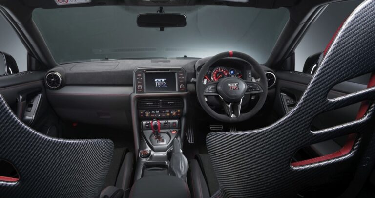 Wewnątrz, producent samochodu poszedł o krok dalej, aby zapewnić lepiej wyglądające i sportowe wnętrze. Podczas gdy GT-R z 2007 roku był wyposażony w fotele kubełkowe z wysokim oparciem, wersja Nismo z 2024 roku ma fotele sportowe z włókna węglowego z przodu. Dodatkowo, deska rozdzielcza pokryta Nappą zmniejszała odblaski i oślepienie, poprawiając widoczność kierowcy. Na szczycie centralnego panelu zainstalowano 8-calowy system infotainment z Apple CarPlay. Dla wybranych rynków dostępne było również radio satelitarne. Aby dodatkowo poprawić dźwięk, Nissan współpracował z Bose przy 11-głośnikowym systemie audio.