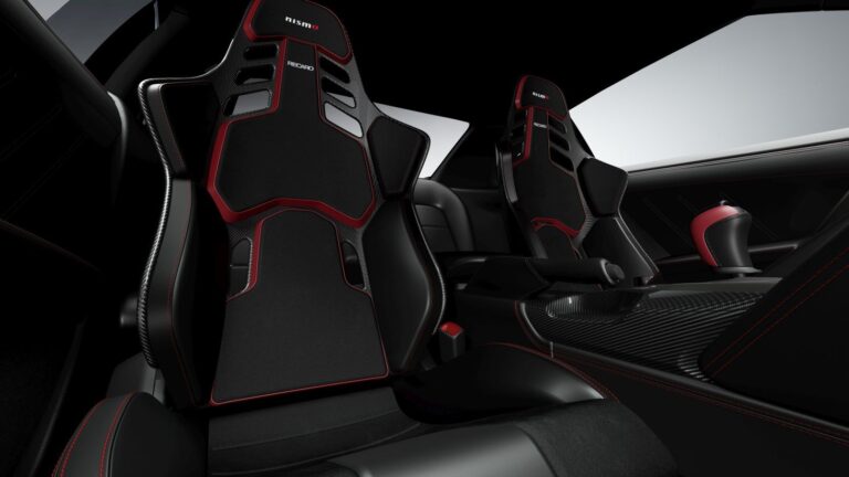 Wnętrze GT-R wita pasażerów deską rozdzielczą w stylu „horyzontalnego przepływu”, pokrytą skórą Nappa, oraz lekkimi siedzeniami.