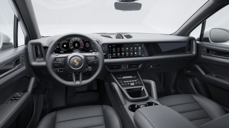 Porsche Cayenne jest najbardziej sportowym samochodem w swoim segmencie – i jego wnętrze odzwierciedla to. Sportowa atmosfera łączy wysoką funkcjonalność, luksusowy komfort i typowe cechy designu Cayenne. Porsche przedstawia nową koncepcję kontroli w nowym Cayenne w czystym designie, który podkreśla szerokość. Zwiększone poziome akcenty deski rozdzielczej sprawiają, że wnętrze wygląda jeszcze szerzej. Projektanci osiągnęli to za pomocą okalającego paska, który kontynuuje się w górę po bokach. Elegancko zaprojektowane otwory wentylacyjne są ustawione pionowo w typowy sposób dla Cayenne. Po raz pierwszy Porsche zaprojektowało wszystkie otwory wentylacyjne w kabinie bez żaluzji.