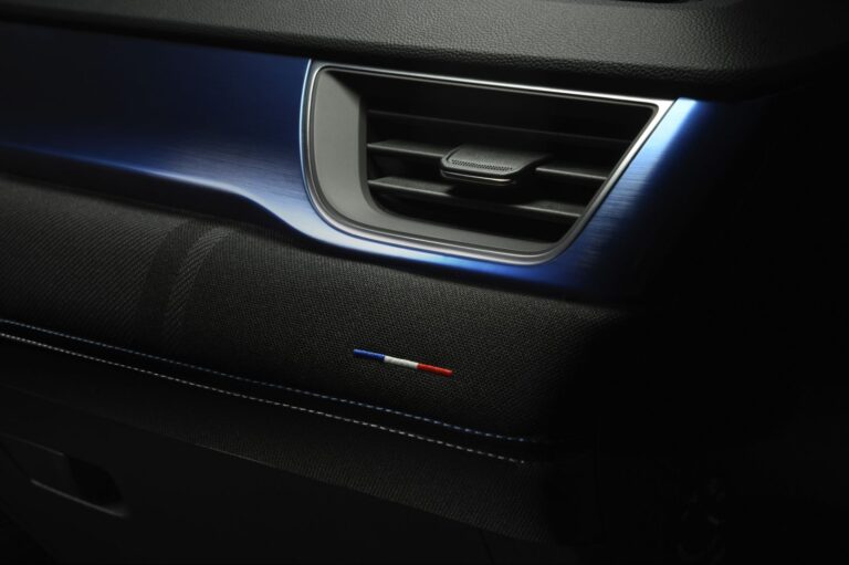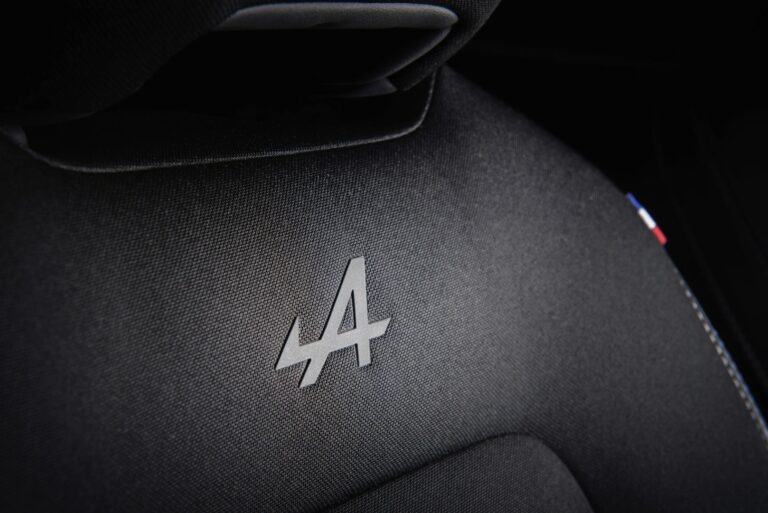 Kabina również odwołuje się do marki Alpine, symbolu sportowej elegancji po francusku, z flagą narodową na bocznych lamówkach, pasami bezpieczeństwa z niebieskim przeszyciem, aluminiowymi sportowymi pedałami, oznakowanymi progami drzwi oraz specjalną kierownicą.