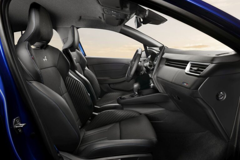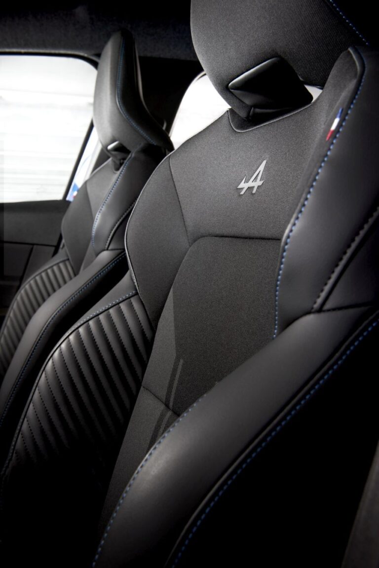 Wnętrze jest również specyficzne dla tej wersji – a jego sportowość i elegancja są w swojej klasie. Kształty siedzeń są bardziej otulające, aby zapewnić lepsze wsparcie boczne i większy komfort. Materiały są ekskluzywne, a środek siedzenia i oparcia są jaśniejsze, aby podkreślić sportowy klimat. Boki pokryte są grubszym materiałem. Wszelkie szczegóły mają specyficzne cechy techniczne, w tym wzór w kształcie litery Y na siedzeniach, przypominający sportowe koszulki sportowców. Niebieskie przeszycia i litera A marki Alpine termicznie wtopiona w tyłu siedzenia dopełniają tę sportową wersję. Czerwona, biała i niebieska flaga, symbolizująca Francję, jest przyszyta po boku.