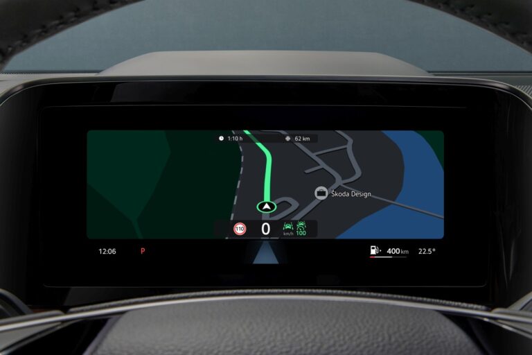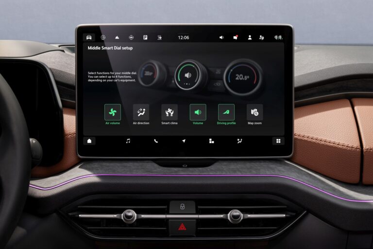 Pokrętła Škoda Smart w drugiej generacji Kodiaq to trzy intuicyjne nowe wielofunkcyjne kontrolery umieszczone poniżej wyświetlacza multimedialnego. Można nimi sterować, obracając je i naciskając, a każde z nich ma cyfrowy wyświetlacz kolorowy o średnicy 32 mm. To sprytne połączenie elementów haptycznych i cyfrowych pozwala na szybki dostęp do wielu funkcji pojazdu. Kontrolery mają matowe wykończenie Unique Dark Chrome i bardzo teksturowaną powierzchnię składającą się z drobnych piramid. Dwa zewnętrzne pokrętła Smart dla kierowcy i pasażera z przodu kontrolują temperaturę wewnętrzną, ogrzewanie siedzeń i wentylację siedzeń. Aktualna funkcja każdego pokrętła jest wyświetlana na wyświetlaczu i można ją zmieniać przez naciśnięcie. Kierowcy mogą dostosować środkowe pokrętło Smart do kontroli do czterech z następujących funkcji: głośności systemu multimedialnego, prędkości wentylatora, kierunku powietrza, inteligentnej klimatyzacji, trybów jazdy i powiększania mapy. Konfiguracja środkowego pokrętła Smart odbywa się za pośrednictwem odpowiedniego menu systemu multimedialnego, a długie naciśnięcie służy do zmiany funkcji. Cztery dodatkowe przyciski sprzętowe między pokrętłami zapewniają bezpośredni dostęp do wentylacji przedniej szyby, ogrzewania tylnej szyby, recyrkulacji powietrza i funkcji automatycznej klimatyzacji. Po raz pierwszy w Škodzie dźwignia zmiany biegów w Kodiaq jest zamontowana na kolumnie kierownicy, co ułatwia dostęp. W rezultacie konsola centralna ma czysty i schludny wygląd, a pojemność schowka wzrosła o 2,1 litra.