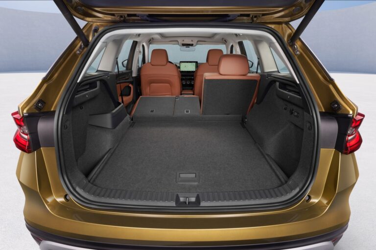 Druga generacja Škody Kodiaq urosła umiarkowanie w porównaniu do swojego poprzednika, ale ma to wielki efekt. Nowa wersja ma 61 mm więcej długości, osiągając 4,758 mm, a rozstaw osi wynosi 2,791 mm. Szerokość wynosząca 1,864 mm oraz prawie niezmieniona wysokość 1,659 mm stwarzają bardzo przestronne wnętrze. W wersji siedmiomiejscowej pasażerowie w trzecim rzędzie siedzeń mają teraz 920 mm przestrzeni na głowę, o 15 mm więcej niż w poprzedniku. Pojemność bagażnika również wzrosła: w wersji pięcioosobowej zwiększyła się o 75 litrów do 910 litrów bez składania tylnych siedzeń. Po złożeniu tylnych siedzeń maksymalna pojemność wzrosła o 40 litrów do 2,105 litrów. W wersji siedmiomiejscowej zmieści się teraz 340 litrów za trzecim rzędem siedzeń, o 70 litrów więcej niż wcześniej, i 845 litrów po złożeniu trzeciego rzędu. To wzrost o 80 litrów. Maksymalna ładowność siedmiomiejscowej wersji wynosi teraz 2,035 litrów, co oznacza wzrost o 30 litrów w porównaniu do pierwszej generacji.