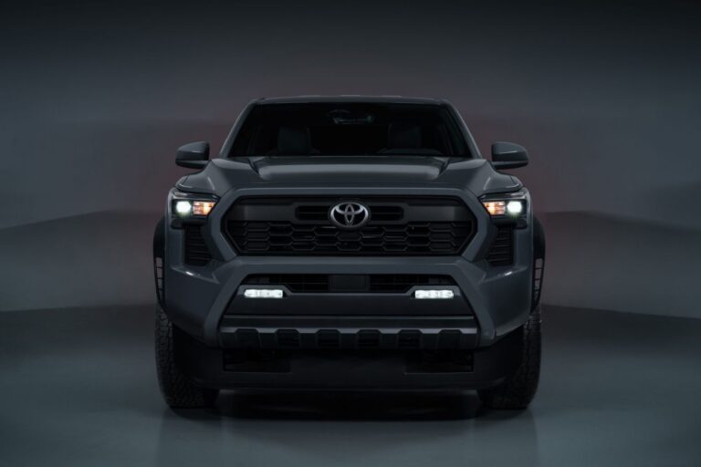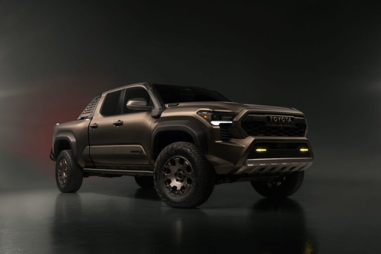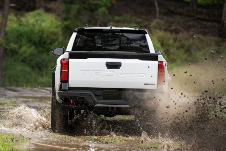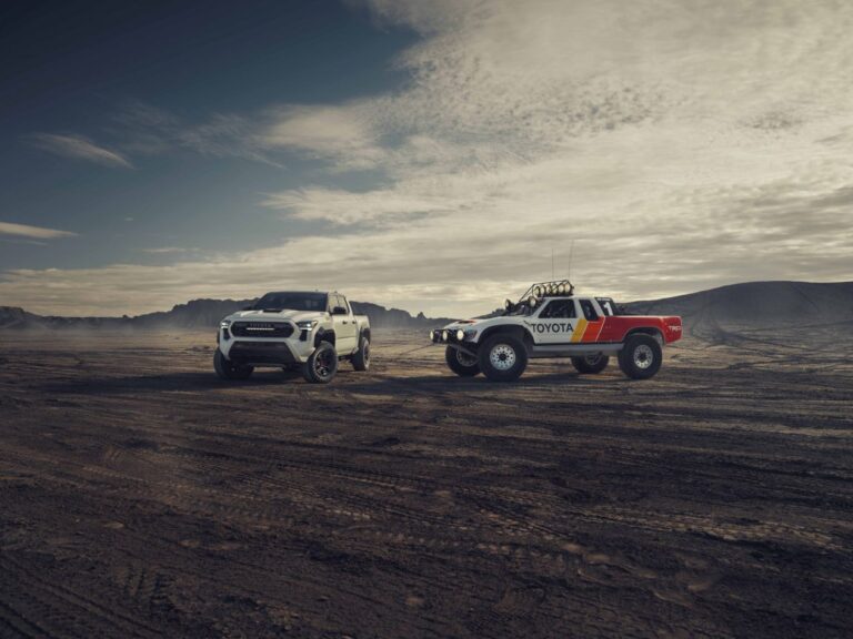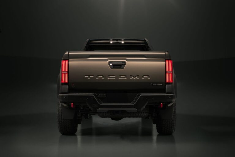 Aby uzyskać bardziej groźną postawę niż kiedykolwiek, TRD Pro siedzi dwa cale wyżej z przodu i półtora cala z tyłu oraz jest o trzy cale szerszy niż Tacoma SR5. Czarne felgi TRD wykonane w technologii flow-forming mają na sobie opony 33-calowe Goodyear Territory R/T. Standardowy silnik i-FORCE MAX w TRD Pro oddycha wydajniej dzięki zwiększonej wydajności powietrza oraz podwójnemu wydechowi TRD. Nowy zintegrowany pasek LED współpracuje z reflektorami LED, aby zoptymalizować wzór wiązki, celując w zrównoważony rozkład światła z znacznie większym zasięgiem, a zestaw białych lamp LED RIGID zwiększa widoczność w trudnych warunkach pogodowych. TRD Pro również otrzymuje nowy metalowy zderzak tylny ARB o wysokim prześwicie z czerwoną haką do odzyskiwania oraz aluminiową płytę osłonową TRD z przodu.