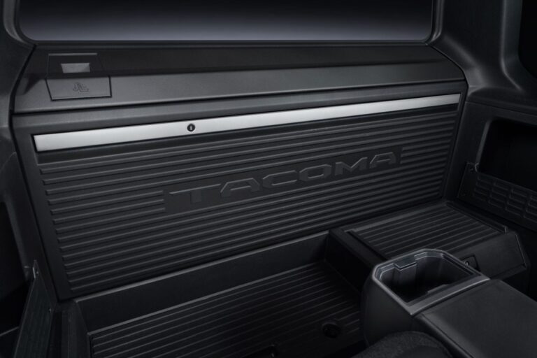 Tacoma maksymalnie wykorzystuje swoją kabinę w tej najnowszej generacji. Modele spalinowe mają trzy razy więcej miejsca do przechowywania pod tylnym siedzeniem w porównaniu do obecnego modelu, a oparcie tylnego siedzenia można również złożyć na płasko w celu stworzenia dodatkowej powierzchni ładunkowej. Półka jest zintegrowana z panelem instrumentów, aby pasażer mógł położyć telefon lub inne małe przedmioty, a panele MOLLE na konsoli centralnej i panelach drzwiowych pozwalają na jeszcze większe możliwości przechowywania. Gumowe uchwyty znajdują się po stronie pasażera na konsoli centralnej, na wszystkich drzwiach oraz po stronie pasażera z przodu. W modelach Double Cab znajdują się również uchwyty pomocnicze na słupku B nad głową. Ukryta kieszeń boczna na desce rozdzielczej po stronie kierowcy ma kod QR, który kieruje właścicieli do strony Toyoty w celu zdobycia wymiarów potrzebnych do zaprojektowania i wydrukowania 3D własnych akcesoriów, takich jak latarka, multitool lub zestaw narzędzi.