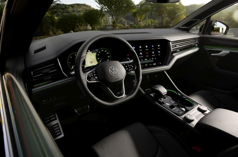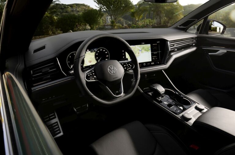 VW Touareg standardowo wyposażony jest w kokpit Innovision – intuicyjne połączenie cyfrowych instrumentów (Digital Cockpit, przekątna wyświetlacza 30,5 cm, 1 920 x 720 pikseli) oraz systemu infotainment Discover Pro Max z centralnym ekranem dotykowym (przekątna wyświetlacza 38,1 cm, 1 920 x 1 020 pikseli). W formie 'one-screen design’, dwa wyświetlacze tworzą ciągły cyfrowy krajobraz na jednej osi widoku i obsługi. Kokpit Innovision oferuje teraz również nawigację na poziomie pasa i wysokiej rozdzielczości dane mapowe HD. System sterowania głosowego Touarega oparty jest również na nowym poziomie rozwoju. Integracja aplikacji za pośrednictwem smartfona i App Connect (Apple CarPlay, Android Auto) może teraz odbywać się bezprzewodowo. Volkswagen zaktualizował przyciski i pokrętło do regulacji głośności w konsoli centralnej – teraz wykonane są na wysoki połysk. Dodatkowo Volkswagen przeprojektował podświetlane wykończenia w panelu deski rozdzielczej i dodał logo Touarega jako wykończenie.