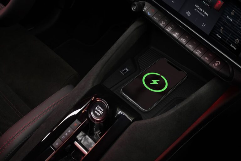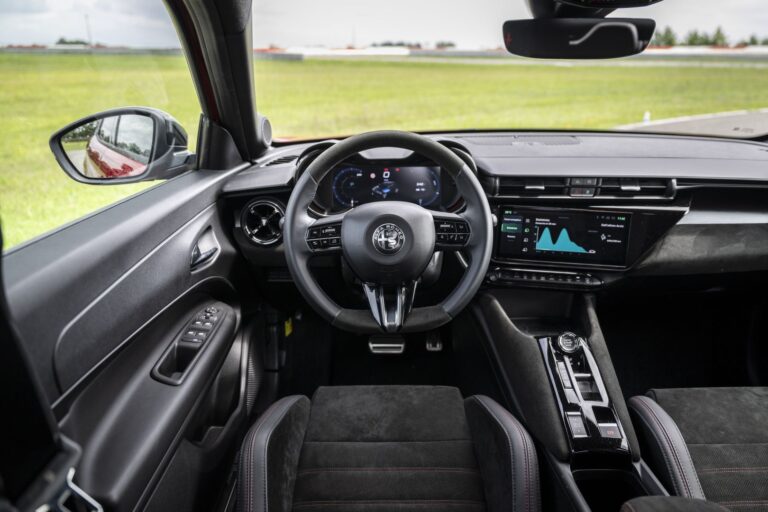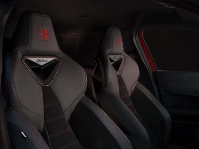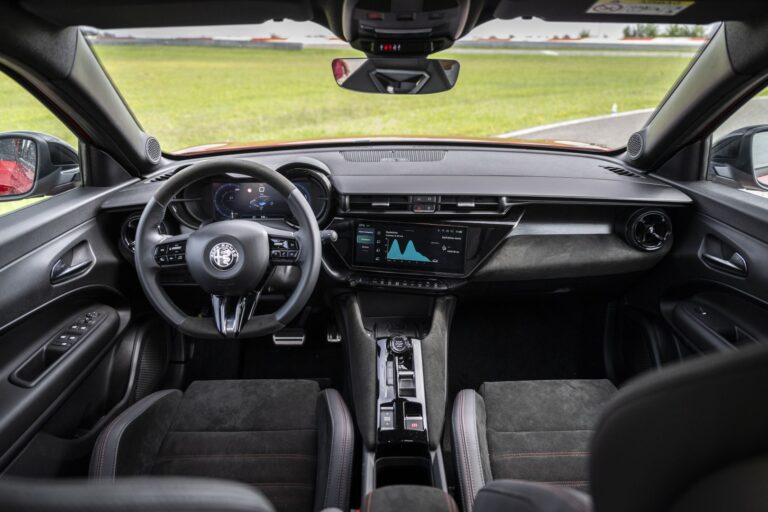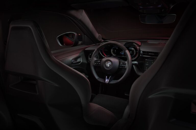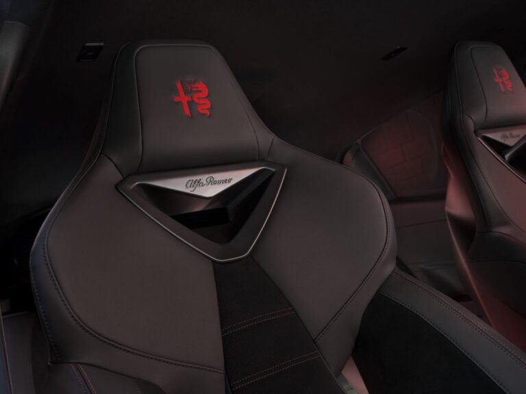Ta sama inspiracja czystą sportowością można odnaleźć wewnątrz samochodu, gdzie wyróżniają się włoska dbałość o każdy detal, użycie najlepszych materiałów oraz umiejscowienie wszystkich przycisków w zasięgu ręki kierowcy, co demonstruje kompaktowa kierownica, dostosowująca się do różnych stylów jazdy. Najważniejsze, że deska rozdzielcza i jej historyczny design 'teleskopowy’ tworzy bezpośrednie połączenie wizualne i przekonuje, by objąć kierownicę, uruchomić silnik i w pełni wykorzystać unikalne doświadczenie jazdy. W środku zestawu wskaźników znajduje się w pełni cyfrowy ekran TFT o przekątnej 10,25″, umożliwiający dostęp do danych samochodu oraz ustawień technologii jazdy. Pośrodku deski rozdzielczej, skierowanego w stronę kierowcy, znajduje się system dotykowy o przekątnej 10,25″, zaprojektowany, aby działać z widgetami, komponentami graficznymi zaprojektowanymi do intuicyjnej interakcji ze wszystkimi funkcjami, które można dostosować za pomocą prostego przeciągania i upuszczania. Każdy użytkownik może stworzyć swoją własną stronę główną, gdzie każda z funkcji samochodu jest aplikacją samą w sobie. Aby dodatkowo ozdobić wnętrze, otwory wentylacyjne w kształcie czterolistnej koniczyny, symbolu sportowości Alfa Romeo. Wreszcie, aby przyciągnąć uwagę i powitać kierowcę, fotele sportowe Sabelt z otaczającym oparciem, łączące wysoką odporność mechaniczną, idealną ergonomię oraz lekkość strukturalną.