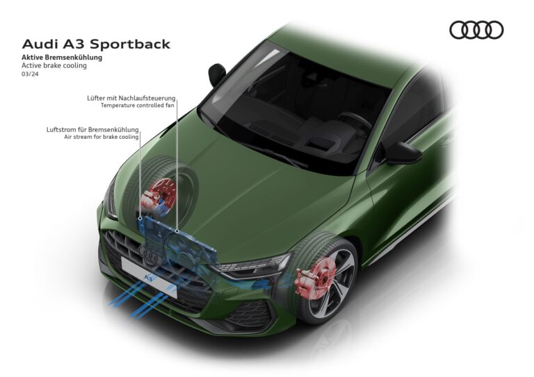 Z przodu, A3 Sportback 2024 zaskoczył swoich klientów wyborem trzech rodzajów świateł. Wszystkie miały technologię LED, ale tylko najwyższa wersja była wyposażona w system Matrix-LED. Pomiędzy nimi producent zainstalował aktywną kratkę chłodnicy, która mogła otwierać lub zamykać swoje klapy, aby wprowadzać więcej lub mniej powietrza do komory silnikowej. Dodatkowo, Audi zainstalowało zestaw wlotów powietrza w centrum, który chłodził przednie tarcze. Z boku, wloty były przykryte estetycznie zaprojektowanymi osłonami, ale nie przepuszczały powietrza.