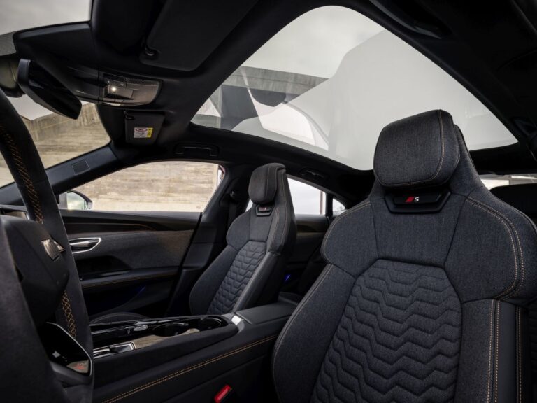 Nowe wersje e-tron GT posiadają kierownicę spłaszczoną u góry i u dołu. W modelach RS kierownica wyposażona jest w dwa czerwone satelity kontrolne i opcjonalnie oznaczenie na godz. 12. fotele zostały również poddane modernizacji. Nowa konstrukcja otwarcia jest bardziej dynamiczna i teraz zawiera wbudowaną wkładkę z podświetlanym logo. S e-tron GT teraz standardowo wyposażony jest w sportowe fotele plus z 14-pozycyjną regulacją. W połączeniu z pakietem designu bez skórzanym, sportowe fotele mają kontrastowe pomarańczowe przeszycia. Dla modeli RS fotele mogą być zamawiane na życzenie z opcjonalną funkcją masażu. Model performance ma ekskluzywny nowy pakiet designu z przeszyciami w kolorze Serpentine Green, pasującymi do zewnętrznego wykończenia Bedford Green, oraz fotele z opcjonalną regulacją 18-pozycyjną.
