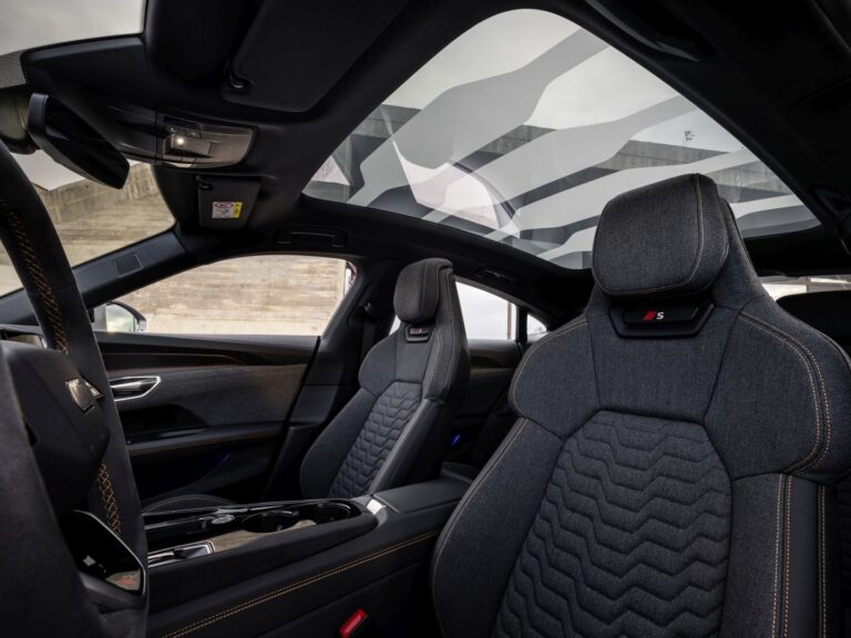 Nowe CI Audi kształtuje również wnętrze, wprowadzając przeprojektowane fotele, kierownicę, progi wejściowe oraz treści cyfrowe. Światło projekcyjne z drzwi zostało również dopasowane. Po otwarciu drzwi kierowcy pojawia się czerwony diament z czerwonym cieniem; wersja S wyróżnia się białym diamentem z czerwonym cieniem. Nowe drewniane wstawki w naturalnej liniowej brzozie antracytowej są dostępne dla rodziny e-tron GT; dla RS e-tron GT performance dostępne są również w matowym kamuflażu węglowym, aby pasować do nadwozia. Nowe elementy wnętrza obejmują aplikacje w wanadycie, antracytowym wykończeniu efektowym, które zmienia się w zależności od oświetlenia. Aplikacje są dostępne opcjonalnie dla S e-tron GT i standardowo w modelach RS.