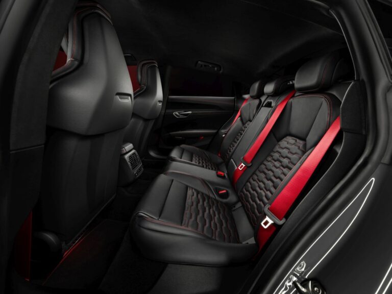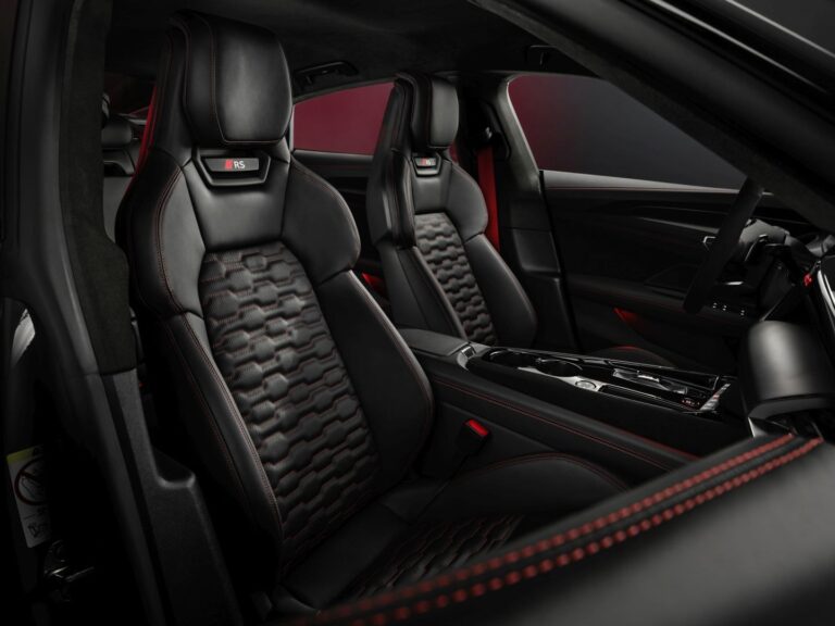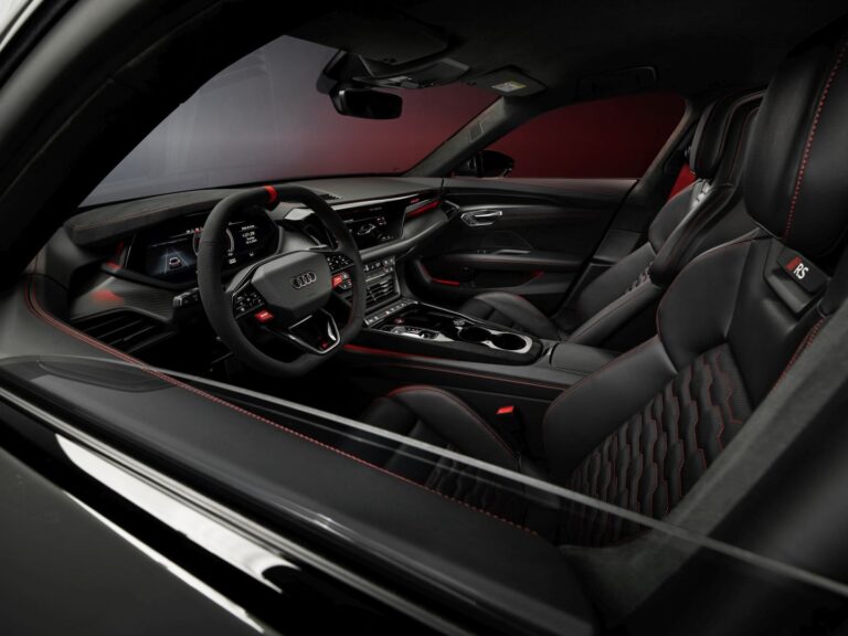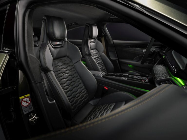 W środku, model 2024 Audi RS e-tron GT oferował połączenie luksusu i sportowości. W przeciwieństwie do wersji S, która była bardziej turystyczna, model RS był lepiej przygotowany na dni torowe. Dlatego wyposażono go w mocno podparte sportowe fotele z zintegrowanymi zagłówkami i emblematami RS na oparciach. Dodatkowo, producent zainstalował unikalną wegańską tapicerkę, a wiele innych elementów wykonano z recyklingowanych materiałów. Z tyłu, kanapa była przystosowana dla dwóch osób, choć były trzy zagłówki. Osoba siedząca na środku musiała zmagać się z końcem konsoli środkowej, co ograniczało przestrzeń na kolana.