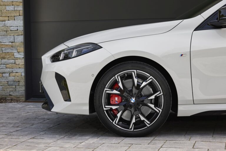 Producent nie szczędził środków przy tworzeniu profilu auta, instalując droższe, ale lepiej wyglądające, rzeźbione drzwi. Były one zgrabnie podkreślone przez progi w kolorze nadwozia, a w zależności od opcji, przez błyszczące czarne akcenty na słupkach lusterek i wokół okien. BMW próbowało ukryć poprzecznie montowany silnik z przodu, tworząc sylwetkę samochodu z kabiną przesuniętą do tyłu. Jednak dłuższy przedni zwis i wyższa maska ujawniały rzeczywiste cechy techniczne pojazdu. BMW serii 1 z 2025 roku było wyposażone w wybór kół o średnicy od 17 do 19 cali, w zależności od wersji i opcji. Z tyłu, poza najostrzejszym modelem, wszystkie wersje miały ukryte wydechy za dolną częścią zderzaka, w którym znajdowało się czarne wykończenie z dyfuzorem, dużym lub małym.