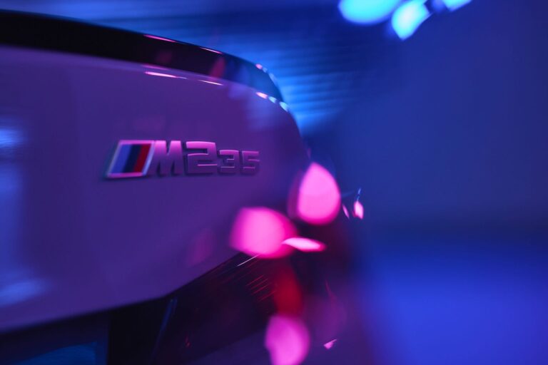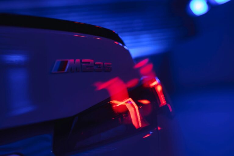 Widok z boku definiuje długa maska, krótkie zwisy oraz łagodnie opadający dach. Wyraźne wcięcie w przejściu do tyłu podkreśla atletycznie uformowaną linię barków. Z tyłu grafika elegancko wydłużonego bocznego okna, dyskretnie wytłoczone „2” akcentuje charakterystyczny załamanie Hofmeistera. Tył zyskuje mocny, nowoczesny wygląd dzięki szerokiej strukturze powierzchni przełamanej jedynie kilkoma liniami, płaskimi światłami o wyrazistym wcięciu oraz niewidocznie zintegrowanymi końcówkami wydechu (wyjątek: BMW M235 xDrive Gran Coupé). Dodatkowe akcenty dla wyrafinowanej dynamiki zapewniają pakiet M Sport oraz pakiet M Sport Pro.