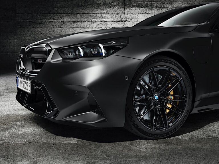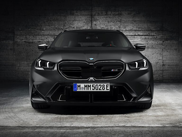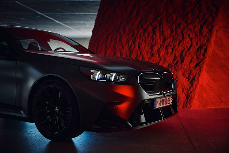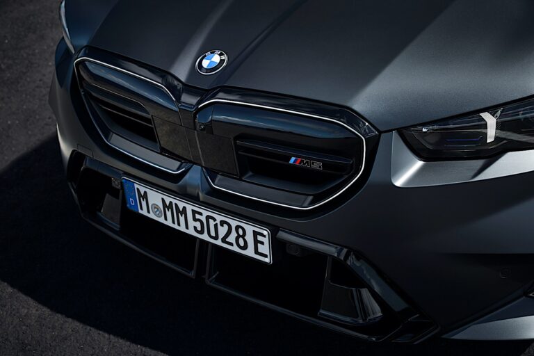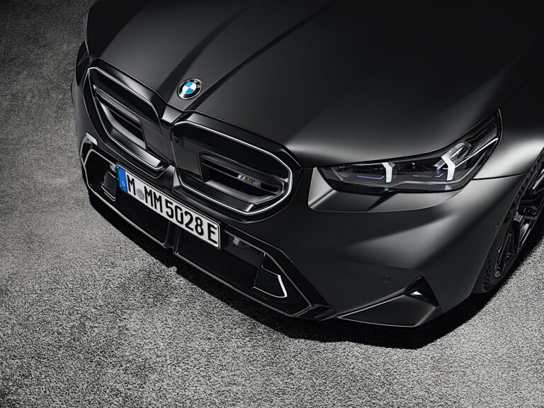 Jego specyficzny dla M przód natychmiast identyfikuje wariant Touring jako członka rodziny modelowej. W sercu nowego BMW M5 Touring znajduje się nowo zaprojektowany grill w kształcie nerki, który jest wykończony na czarno w połysku i prawie całkowicie zamknięty. Emblemat „M5” znajduje się na poziomym, charakterystycznym dla M podwójnym pasku. Podczas gdy środek grilla w kształcie nerki BMW zawiera czujniki dla systemów wspomagania kierowcy, w jego dolnej części znajdują się dwa małe, matowe wloty powietrza, które zapewniają optymalną regulację temperatury, efektywnie kierując nadchodzące powietrze do chłodnicy. Purystyczne podejście umożliwia nowatorską estetykę designu, która prezentuje się efektownie dzięki czarnemu obramowaniu i standardowemu oświetleniu konturowemu BMW Iconic Glow dla grilla w kształcie nerki BMW.