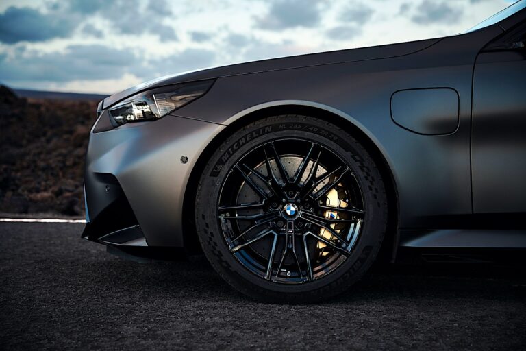 Nowe, wyglądające na lekkie koła M w podwójnym układzie szprych i dwukolorowym wykończeniu zwiększają sportowy wygląd samochodu z boku. Ich specyficzne dla osi wymiary wynoszą 20 cali na przedniej osi i 21 cali na tylnej, co pozwala na maksymalne wykorzystanie dynamicznego potencjału nowego BMW M5 Touring, optymalizując jego zdolność do przenoszenia sił zakrętu na drogę. Wyposażone w opony 285/40 ZR20 z przodu i 295/35 ZR21 z tyłu, zapewniają znakomitą stabilność w zakrętach, jak również precyzyjne czucie kierownicy i optymalną przyczepność – nawet podczas intensywnej jazdy na torze wyścigowym. Szczególnie duża średnica kół i diamentowo-polishowane krawędzie obręczy podkreślają rozmiar kół.