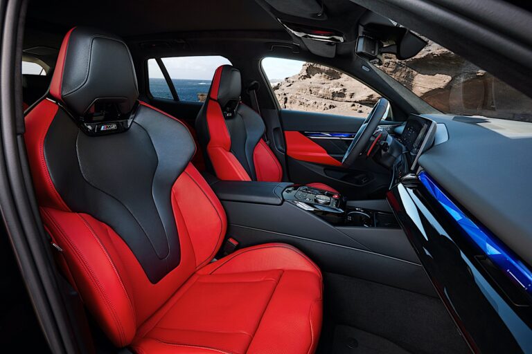 W środku na klientów czekał zakrzywiony ekran umieszczony na górze deski rozdzielczej, podobnie jak w pozostałych modelach serii 5. Jednak BMW wprowadziło pewne zmiany w menu, oferując podmenu ukierunkowane na M, które umożliwiały klientom wykorzystanie pełni mocy i osiągów modelu. Standardowo zamontowano zestaw foteli kubełkowych o wysokich bocznych podporach, a w opcji dostępne były sportowe fotele. Z tyłu producent umieścił kanapę z dzieleniem 40/20/40, która pomieściła do trzech dorosłych. Po złożeniu kanapy pojazd uzyskiwał łączną przestrzeń ładunkową wynoszącą 1630 litrów (57,6 cu-ft), co było więcej niż wystarczające dla rodziny czwórki na krótki urlop.