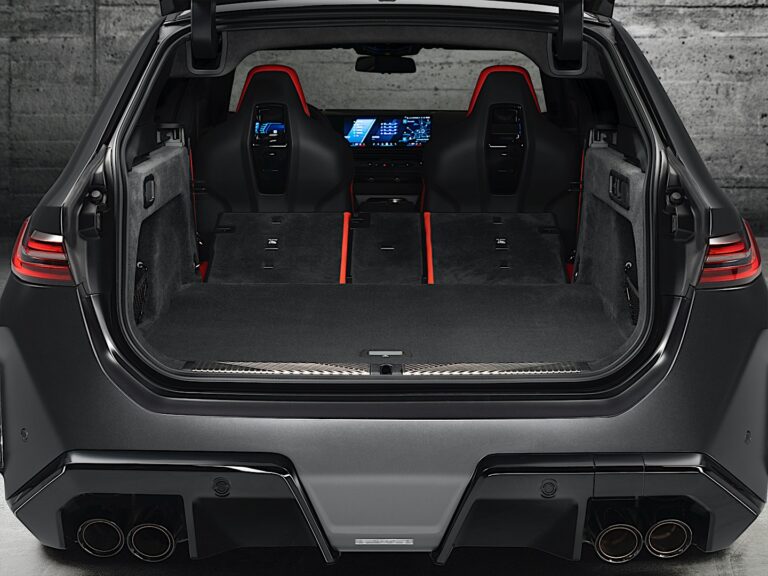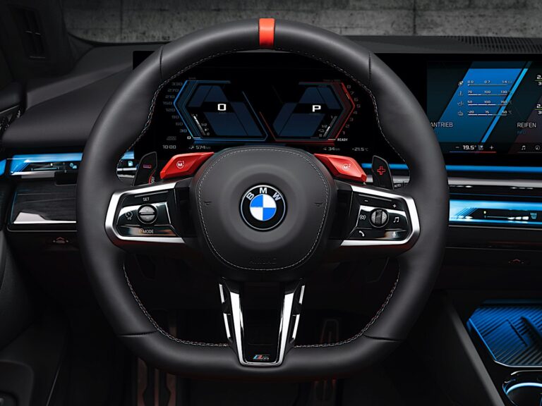 BMW wzięło nadwozie klasycznego 5 Series Touring (G61) i wzbogaciło je o szczegóły charakterystyczne dla serii M. Lusterka drzwiowe mają aerodynamiczne wsporniki i pokrywy z włókna węglowego. Płaskie klamki drzwiowe pasowały do koloru pojazdu, a rzeźbione drzwi z wznoszącą się linią przetłoczenia na dolnej stronie sprawiały, że kombi wyglądało na szybkie. Dodatkowo, z lekko opadającą linią dachu i przyciemnionymi słupkami, BMW M5 Touring 2025 miało wszystkie niezbędne elementy, by przekonać klientów, że to znakomity samochód rodzinny, który nie wygląda nudno. Z tyłu producent dodał dłuższy spojler dachowy niż w zwykłym Touring oraz tylny zderzak z czterema wylotami spalin, flankowanymi przez ogromny dyfuzor.