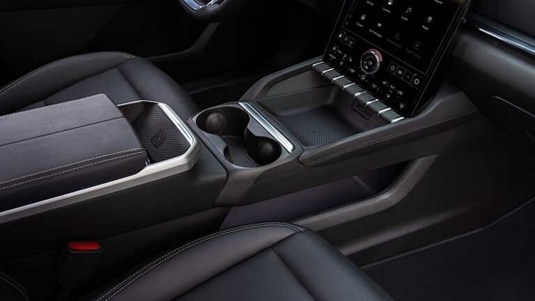 Nowy design wnętrza podkreśla długie, płynne linie, aby uwydatnić szerokość kabiny, z dekoracjami chromowanymi biegnącymi wzdłuż wstawki IP, górnych drzwi i podłokietnika konsoli. Dostępne ładowarki bezprzewodowe4 znajdują się w dogodnej lokalizacji blisko podłokietnika.