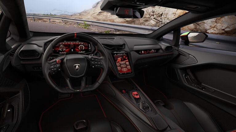 Większość super samochodów Lamborghini była ciasna i ledwo zapewniała miejsce dla dwóch dorosłych osób w kokpicie. Jednak włoski producent uczynił model 2025 Temerario bardziej komfortowym niż jego poprzednik, Huracan. Dzięki dłuższemu rozstawowi osi i wyższej kabinie, w porównaniu do samochodu, który zastąpił, było wystarczająco dużo miejsca dla dorosłych pasażerów. Dodatkowo sportowe fotele kubełkowe z wysokimi bocznymi oparciami opierały się na cienkich ramach z włókna węglowego, ale miały wystarczająco dużo wyściółki, aby zapewnić komfort podczas jazdy po zwykłych drogach. W kabinie nie było żadnych analogowych wskaźników. Zamiast tego Lamborghini zainstalowało trzy ekrany. Jedno z nich znajdowało się przed kierowcą jako konfigurowalny panel instrumentów, drugie umieszczone na górze centralnej konsoli pełniło funkcję centrum multimedialnego oraz sterowania różnymi funkcjami pojazdu (w tym klimatyzacją), a trzecie było przed pasażerem. Mogli z niego korzystać do kontrolowania multimediów lub innych funkcji i informacji. Kierownica była przeładowana 21 przyciskami i przełącznikami, w tym klaksonem i manetkami zmiany biegów. Na konsoli centralnej znajdowało się również kilka innych przycisków do sterowania skrzynią biegów i elektrycznym hamulcem ręcznym.