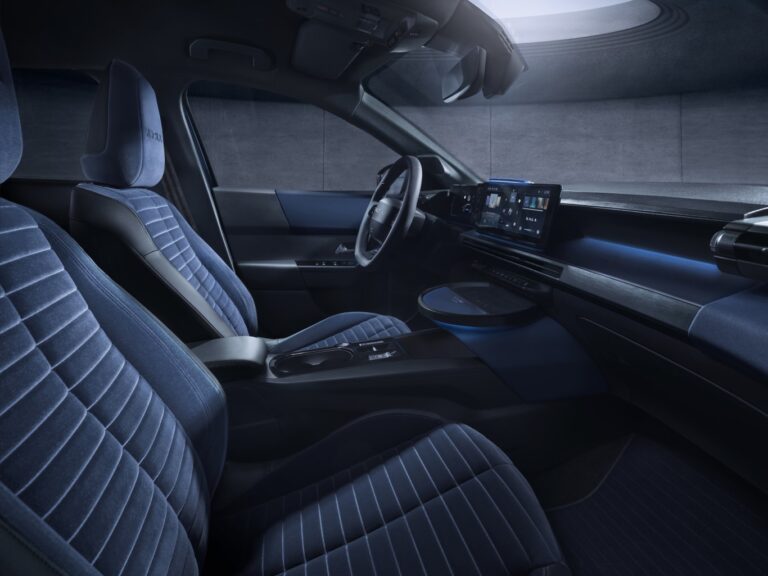 A 'salon’ jest także wyrażany przez inne komponenty wewnętrzne, takie jak regulowane, masujące i podgrzewane fotele elektryczne, które stały się prawdziwymi fotelami z prążkowanym splotem, a siedziska i oparcia wykonano z niebieskiego aksamitu z 100% przędzy z recyklingu. Wszystko to jest jeszcze bardziej angażujące dzięki doskonałemu komfortowi akustycznemu kabiny, aby maksymalizować dobre samopoczucie w samochodzie.