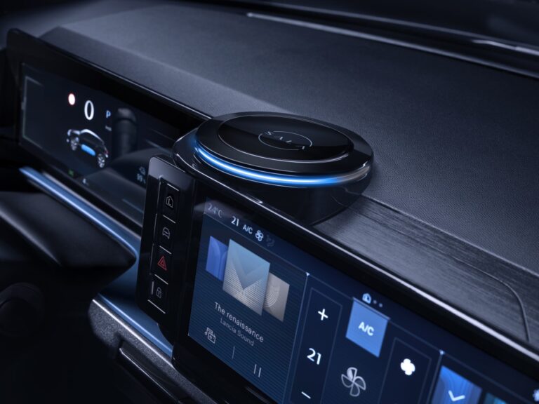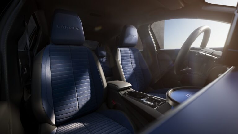 Nowe litery pojawiają się także na błyszcząco czarnym przodzie, inspirowanym Lancią Beta Montecarlo. Napis Lancia wyróżnia się nad nowoczesną reinterpretacją historycznego grilla, 'chalice’, przeniesioną w przyszłość przez futurystyczne trzy promienie światła LED, które czynią go ikonicznym, niezapomnianym i rozpoznawalnym z daleka, zarówno w dzień, jak i w nocy. Ten podwójny podpis 'litery chalice’ ma pojawić się na przedniej części wszystkich trzech nowych modeli marki: 'chalice światła’, które wirtualnie obejmuje nazwę marki i wyraźnie oznacza nową tożsamość Lancia, gdy wchodzi w erę elektryczną.